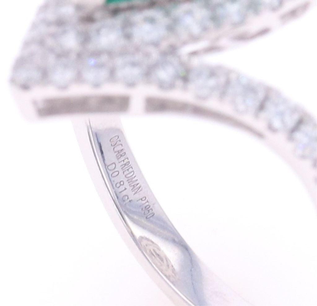 Featured in this lot is this GIA 3.03ct emerald VS2 diamond and platinum ring with GIA and AIGL paperwork. The ring features a polished, stamped, and tested platinum construction that is marked as follows: Oscar Friedman - PT950. The ring features a freeform ring band and setting with a natural pear cut Russian Emerald with measurements of 13.87 x 8.11 x 4.45mm that shows a green coloration and shows a total weight of 3.03ct. The freeform shoulders and center stone are decorated with a total of 42 round brilliant cut diamonds that shows measurements of 1.5 - 1.8mm and shows a clarity of VS2 - SI1 with a color grade of F - G and a total weight of 0.81ct. The piece comes complete with AIGL Inc.(American International Gemological Laboratories, Inc. a GIA certified lab AIGL#: K58E82-EA21746) report and appraisal confirming the above info and giving a total value of $20,353.00. GIA (Gemological Institute of America) Emerald Grading Report#: 2239419975. The ring size is US 7.