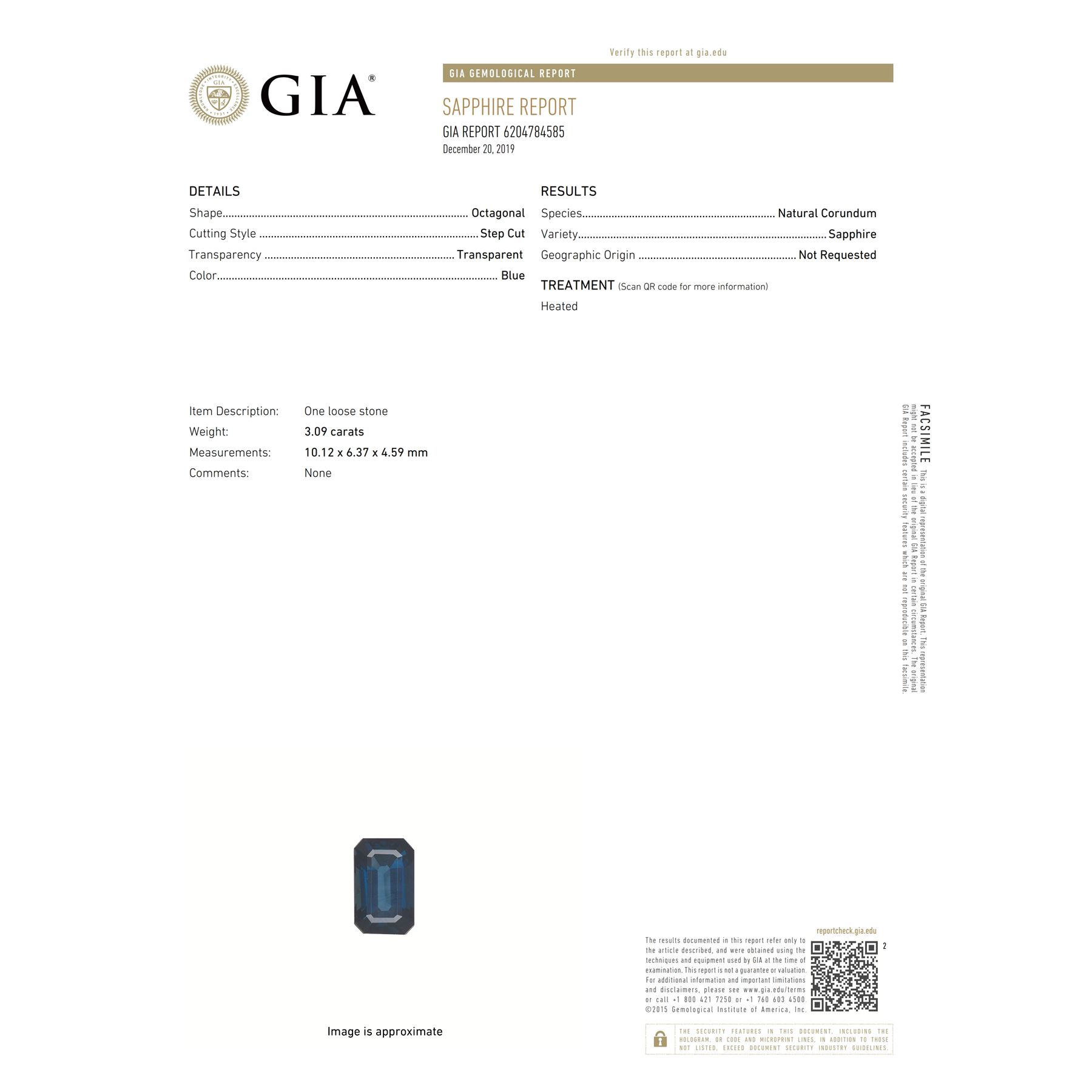 GIA 3.09ct Octagonal Shape Blue Sapphire 10.12 x 6.37 x 4.59 mm GIA #6204784585