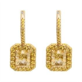 WOW! These Earrings in 18k Yellow Gold With 2 Fancy Light Yellow Radiant Cut Diamonds: 1.50ct Fancy Light Yellow (VVS2) Radiant Shape Diamond GIA # 2456872042 1.50ct Fancy Light Yellow (VS1) Radiant Shape Diamond GIA # 5453858760 Total carat weight of fancy yellow pave: 0.76 ct. VVS/VS.. Gold Weight: 10.86 Grams. All lots will be shipped via Fed-Ex/UPS Insured with Adult signature required. Any questions please ask..