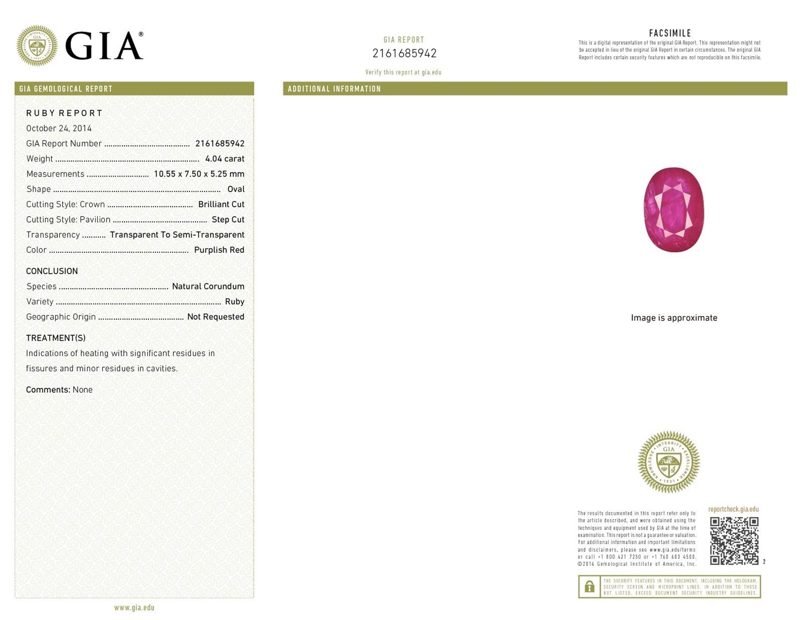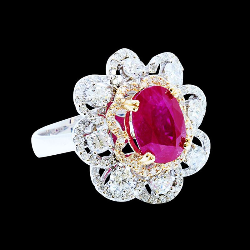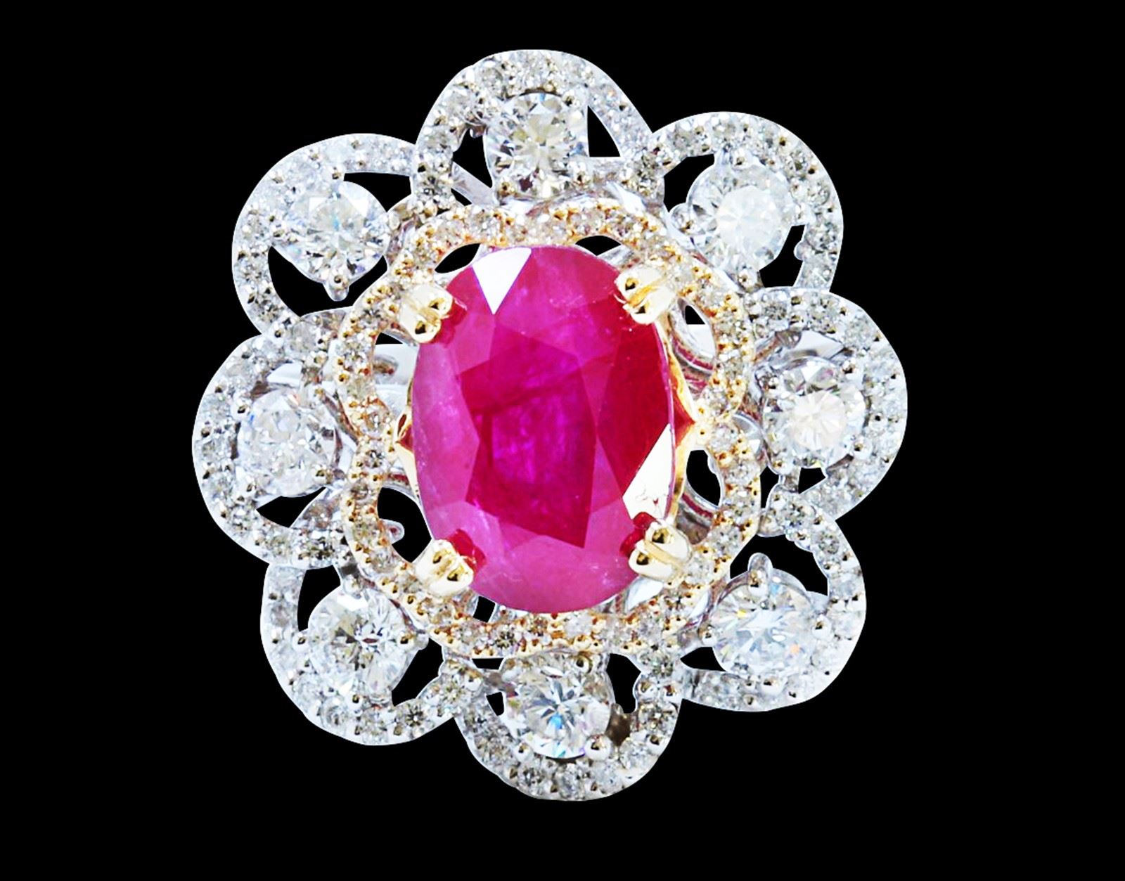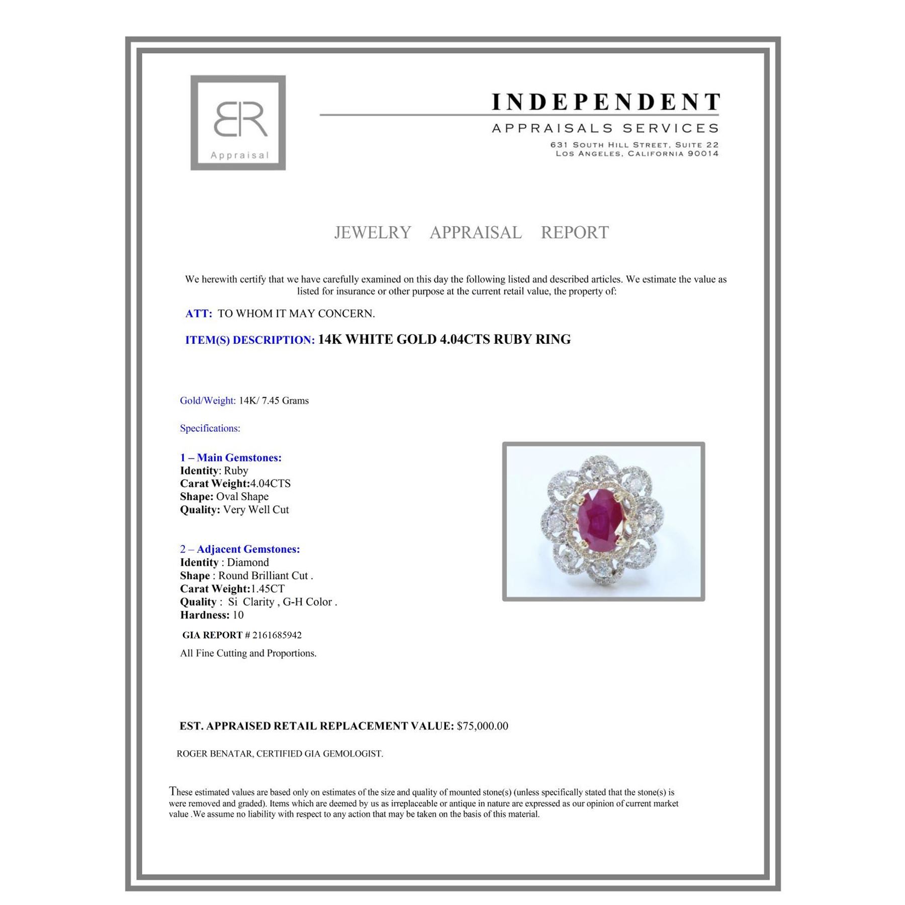 14K WHITE GOLD BURMA NATURAL RUBY(NO LEAD FILLING) RING:7.45 GRAMS/DIAMOND:1.45CT/RUBY:4.04CT/GIA #2161685942/#GVR1162 **Warmly crafted in 14K gold, this ravishing 4.04ct Oval Brilliant Cut Ruby demands full attention. A gemstone of novelty and adventure, it is ensconsed with a halo of twinkling 1.45ct Round Cut Diamonds in a flower motif, which delightfully brighten the hue and capture the eye. This fantastic cocktail ring is an investment piece, guaranteed and long lasting.**