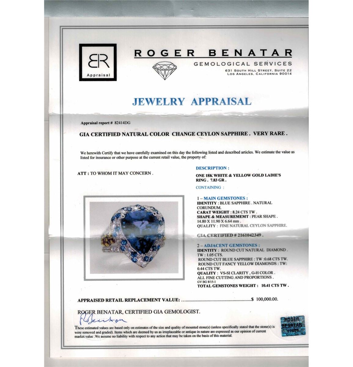 18K WHITE YELLOW GOLD CEYLON BLUE SAPPHIRE(COLOR CHANGE NO HEAT) RING:7.83 GRAMS/DIAMOND:1.05CT/BLUE SAPPHIRE(MAINSTONE):8.21CT/BLUE SAPPHIRE(SIDESTONE):0.68CT/GIA #2161042349/#GVR1186