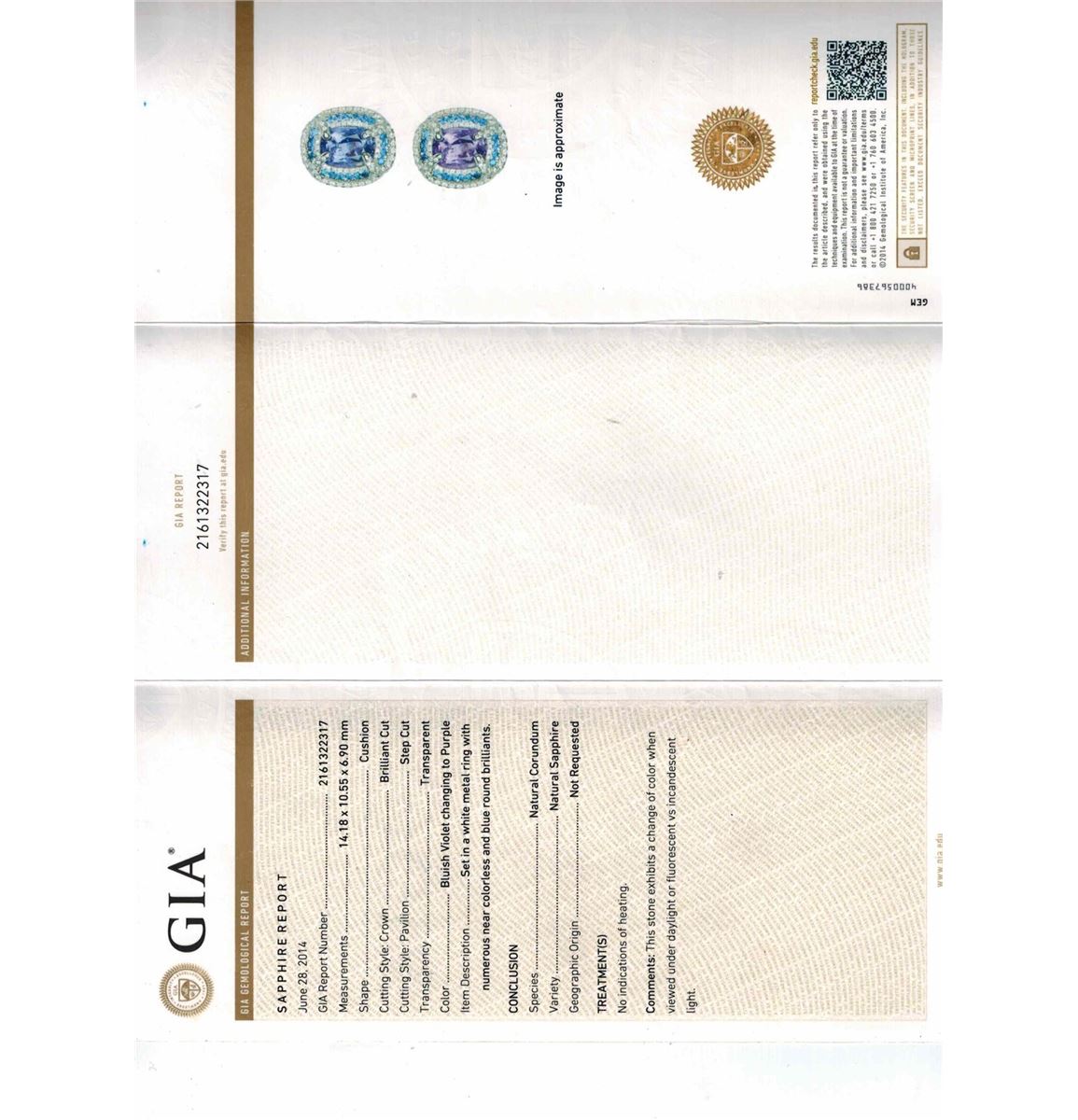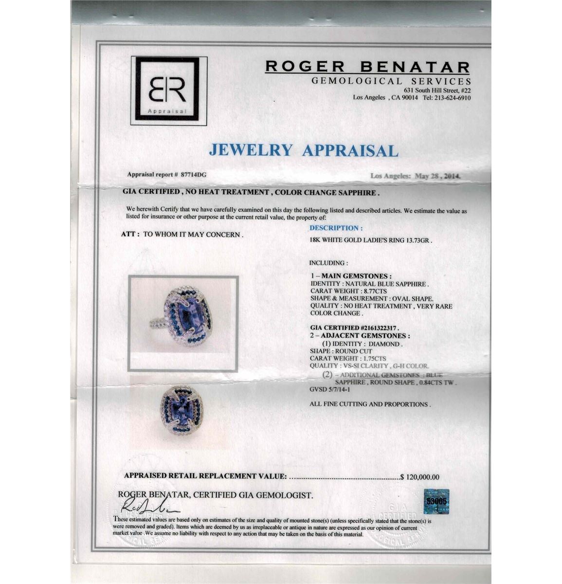 18K WHITE GOLD NATURAL BLUE CEYLON SAPPHIRE (COLOR CHANGE NO HEAT) RING:13.73 GRAMS/DIAMOND:1.75CT/BLUE CEYLON SAPPHIRE(MAINSTONE):8.77CT/BLUE SAPPHIRE(SIDESTONE):0.84CT/GIA #2161322317/#GVR1188