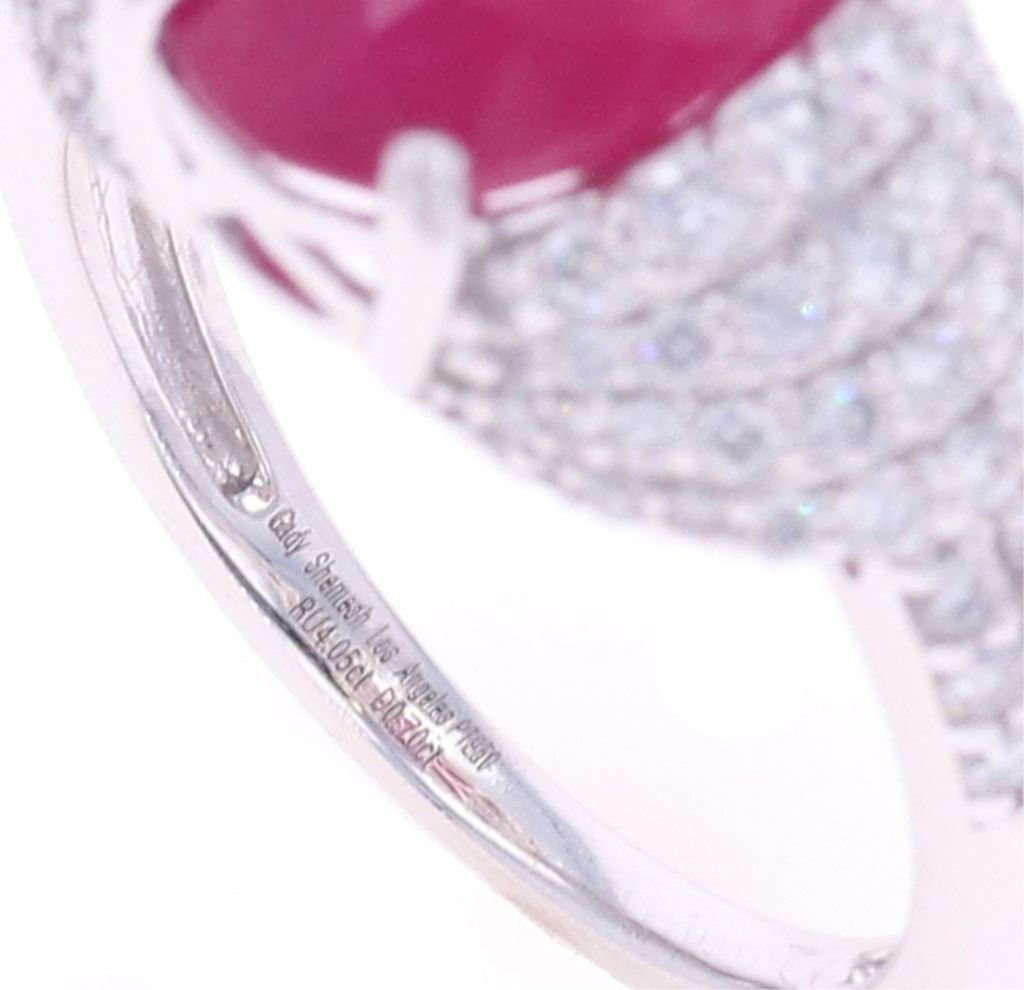 Featured in this lot is this GIA Burmese Ruby VS2 diamond and platinum ring with GIA and AIGL paperwork. The ring features a polished, stamped, and tested platinum construction that is marked as follows: Gady Shemesh Los Angeles - PT950. The center stone set to the antique ring setting is a natural oval Burmese ruby that shows measurements of 11.47 x 8.22 x 5.02mm that shows purplish red coloration with a total weight of 4.05ct. The antique setting and pave shoulders are decorated with a total of 92 round brilliant cut diamonds with measurements of 1.0 - 1.8mm with VS2 - SI2 clarity and F - G color grade and shows a total diamond weight of 0.70ct. The piece comes complete with AIGL Inc.(American International Gemological Laboratories, Inc. a GIA certified lab AIGL#: K65E63-EA21236) report and appraisal confirming the above info and giving a total value of $21,430.00. GIA (Gemological Institute of America) Ruby Grading Report#: 2239388717. The ring size is US 7.