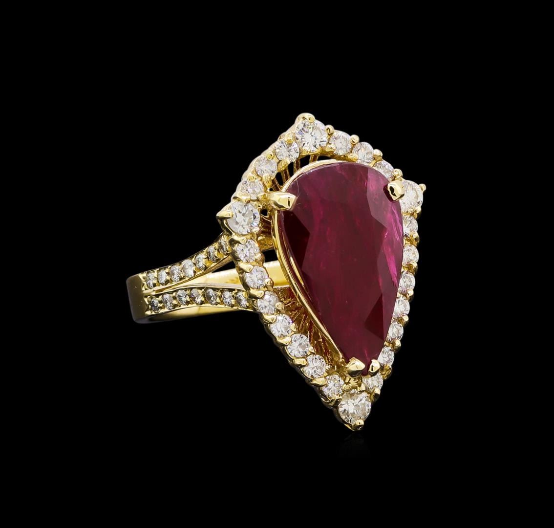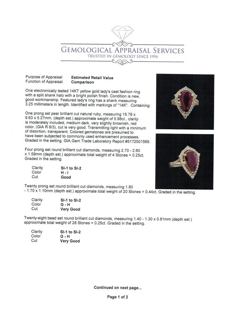 One electronically tested 14KT yellow gold lady's cast fashion ring with a split shank halo with a bright polish finish. Featured lady's ring has a shank measuring 3.25 millimeters in length. Identified with markings of "14K". Condition is new, good workmanship. Containing: One prong set pear brilliant cut natural ruby, measuring 15.78 x 9.63 x 5.27mm, (depth est.) approximate weight of 5.98ct., clarity is moderately included, medium dark, very slightly brownish, red color, (GIA R 6/3), cut is very good. Transmitting light with a minimum of distortion, transparent. Colored gemstones are presumed to have been subjected to commonly used enhancement processes. Graded in the setting. GIA Gem Trade Laboratory Report #5172501569.Four prong set round brilliant cut diamonds, measuring 2.70 - 2.60 x 1.59mm (depth est.) approximate total weight of 4 Stones = 0.25ct. Graded in the setting. Clarity: SI-1 to SI-2. Color: H - I. Cut Good Twenty prong set round brilliant cut diamonds, measuring 1.80 - 1.70 x 1.10mm (depth est.) approximate total weight of 20 Stones = 0.44ct. Graded in the setting. Clarity: SI-1 to SI-2. Color: G - Very Good Twenty-Eight bead set round brilliant cut diamonds, measuring 1.40 - 1.30 x 0.81mm (depth est.) approximate total weight of 28 Stones = 0.25ct. Graded in the setting. Clarity: SI-1 to SI-2. Color: G - Very Good. Total Weight of Colored Stones 5.98ct. Total Weight of Diamonds 0.94ct. Total Weight of Ring 7.70gm. GAS Appraised at $11,405.00.