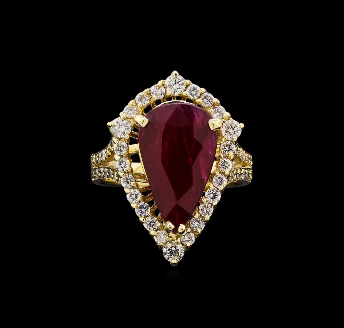 One electronically tested 14KT yellow gold lady's cast fashion ring with a split shank halo with a bright polish finish. Featured lady's ring has a shank measuring 3.25 millimeters in length. Identified with markings of "14K". Condition is new, good workmanship. Containing: One prong set pear brilliant cut natural ruby, measuring 15.78 x 9.63 x 5.27mm, (depth est.) approximate weight of 5.98ct., clarity is moderately included, medium dark, very slightly brownish, red color, (GIA R 6/3), cut is very good. Transmitting light with a minimum of distortion, transparent. Colored gemstones are presumed to have been subjected to commonly used enhancement processes. Graded in the setting. GIA Gem Trade Laboratory Report #5172501569.Four prong set round brilliant cut diamonds, measuring 2.70 - 2.60 x 1.59mm (depth est.) approximate total weight of 4 Stones = 0.25ct. Graded in the setting. Clarity: SI-1 to SI-2. Color: H - I. Cut Good Twenty prong set round brilliant cut diamonds, measuring 1.80 - 1.70 x 1.10mm (depth est.) approximate total weight of 20 Stones = 0.44ct. Graded in the setting. Clarity: SI-1 to SI-2. Color: G - Very Good Twenty-Eight bead set round brilliant cut diamonds, measuring 1.40 - 1.30 x 0.81mm (depth est.) approximate total weight of 28 Stones = 0.25ct. Graded in the setting. Clarity: SI-1 to SI-2. Color: G - Very Good. Total Weight of Colored Stones 5.98ct. Total Weight of Diamonds 0.94ct. Total Weight of Ring 7.70gm. GAS Appraised at $11,405.00.