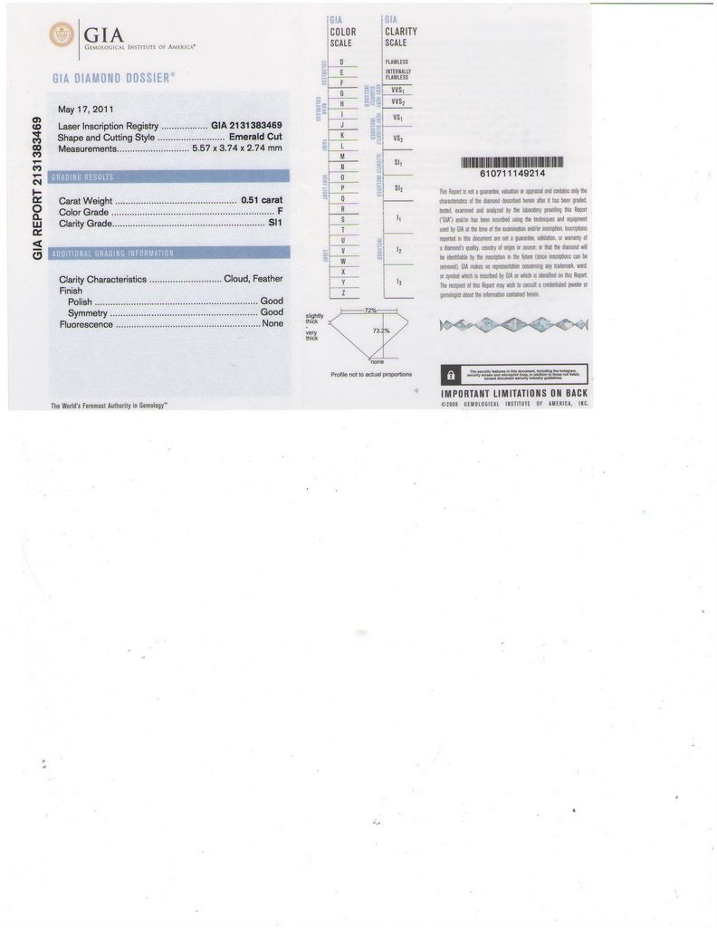 GIA CERTIFIED Emerald 0.51 Carat F,SI1 **|**|** Shape: Emerald ; CTW: 0.51 ; Color: F ; Clarity: SI1 ; Sym: G ; Flour: G ; Meas: 5.57x3.74x2.74 ; Certification: GIA ; Table: 73.2 ; Girth: 72 ; Comment: 110 CLEAN ; MSRP: $2900