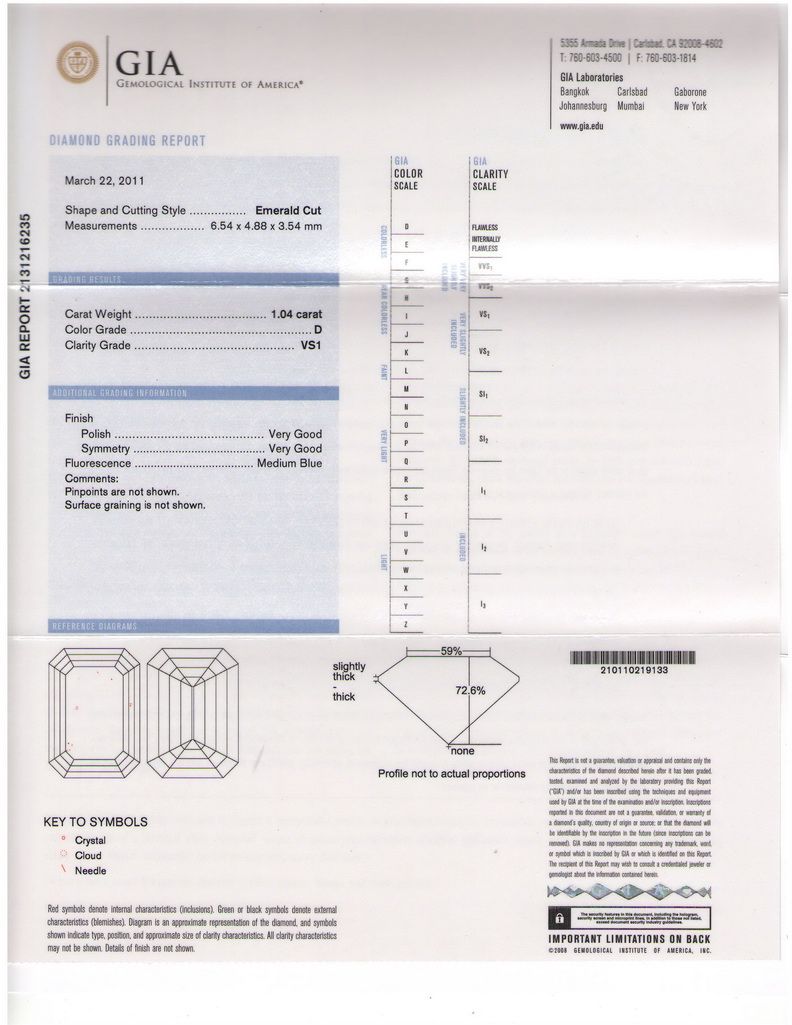 GIA CERTIFIED Emerald 1.04 Carat D,VS1 **|**|** Shape: Emerald ; CTW: 1.04 ; Color: D ; Clarity: VS1 ; Sym: VG ; Flour: VG ; Meas: 6.54x4.88x3.54 ; Certification: GIA ; Table: 72.6 ; Girth: 59 ; Comment: FULL OF LIFE ; MSRP: $21700