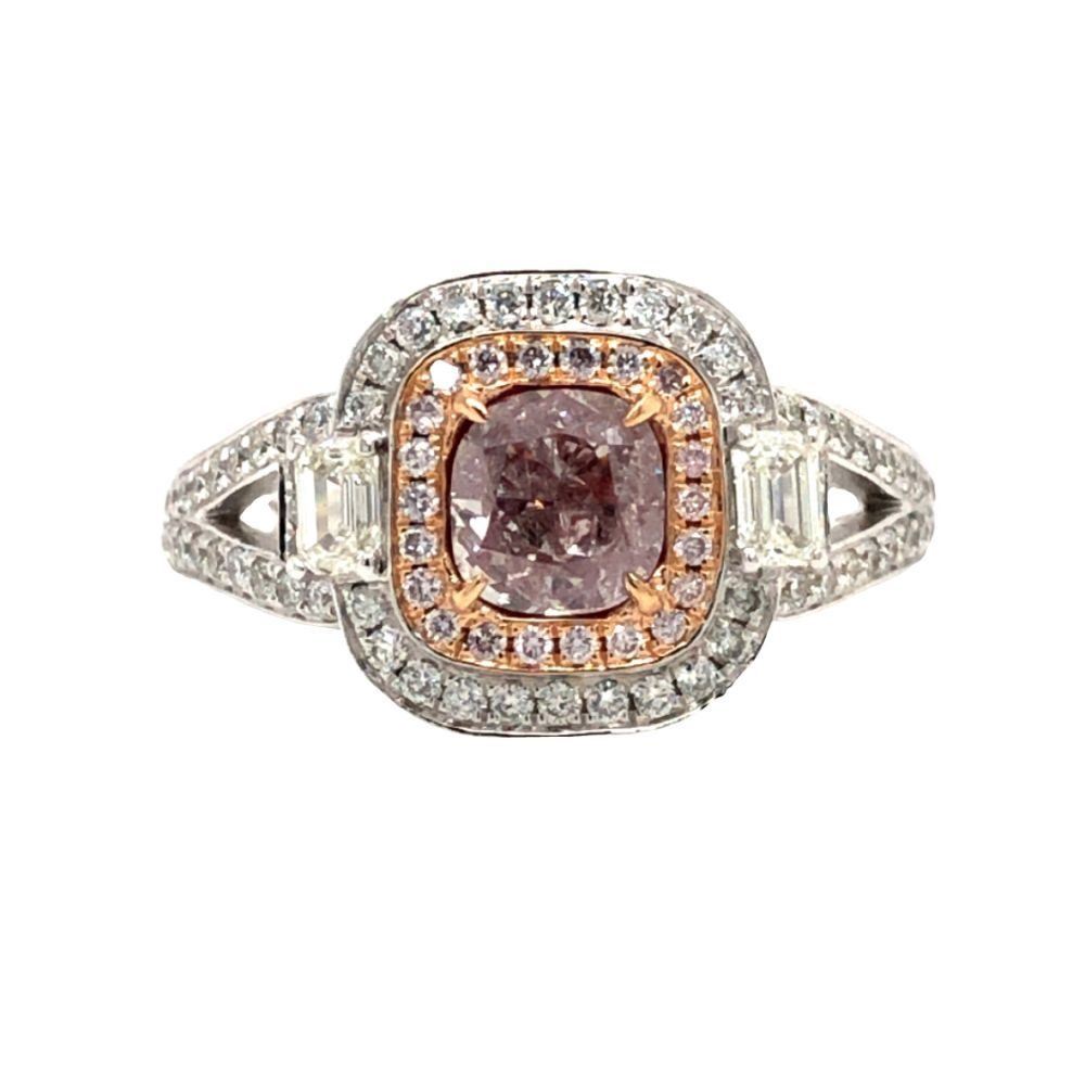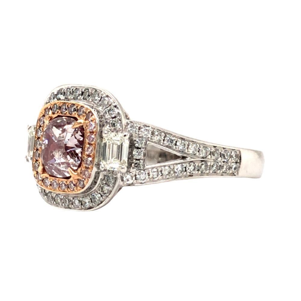 ADDITIONAL INFORMATION:& nbsp; One of nature's rarest colored diamonds is a pink diamond.& nbsp; This white gold ring features a GIA certified natural, fancy light-pink, diamond that is set with rose gold claw prongs inside a halo of fancy, light pink diamonds, also in rose gold prongs.& nbsp; These diamonds are supported by a& nbsp; white gold, color-enhancing bezel cup.& nbsp; A floating halo of round, brilliant-cut diamonds, separated at the midsection by glamorous emerald-cut diamonds, surround the fancy, light, pink diamonds.& nbsp; Supporting the gemstones are prong-set diamond, split shoulders that taper to an approximate 2.5mm polished shank.& nbsp;