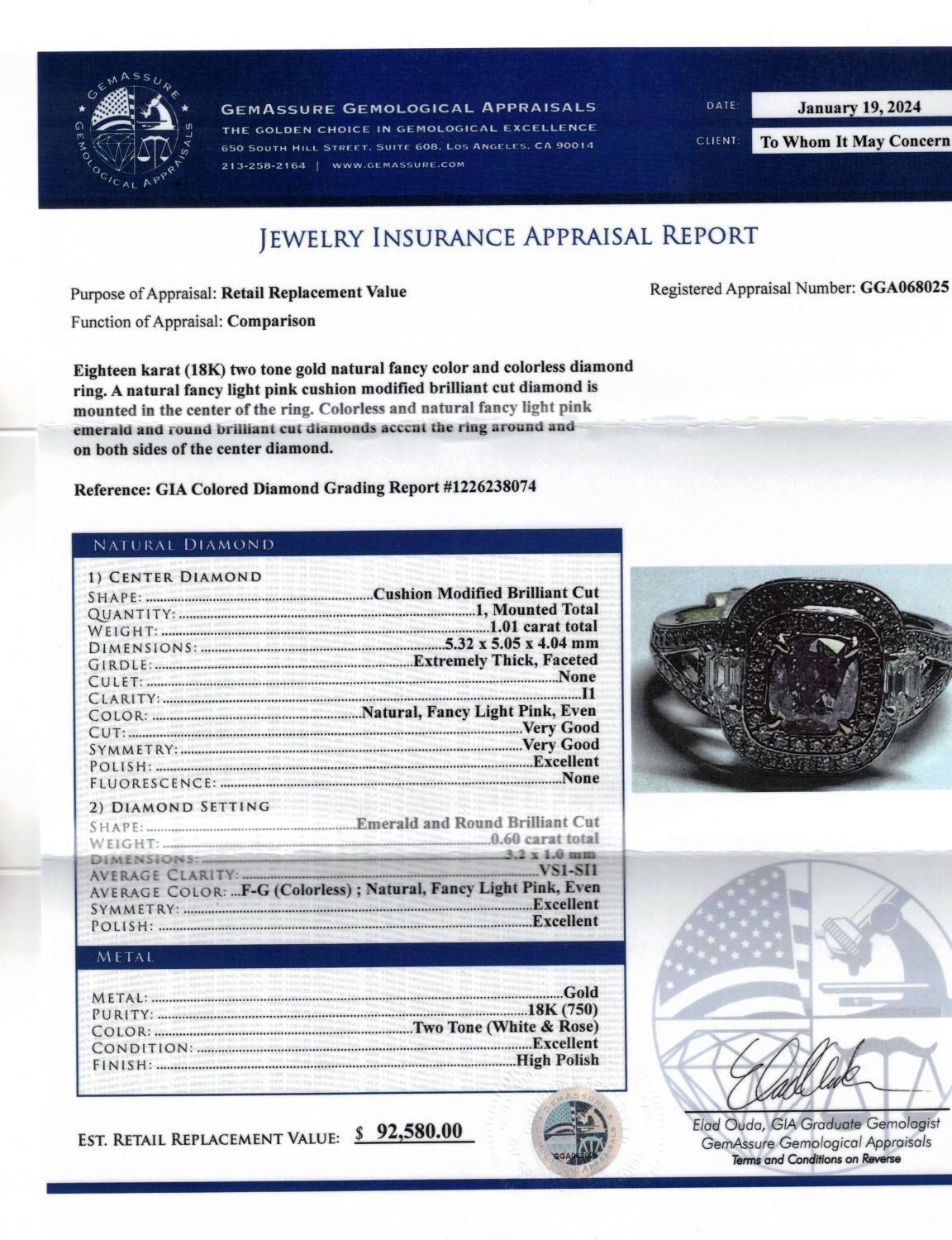 APPRAISAL DETAILS: This ring is certified and appraised for $92,580.00 estimated retail replacement value by GemAssure Gemological Appraisals (GGA).
