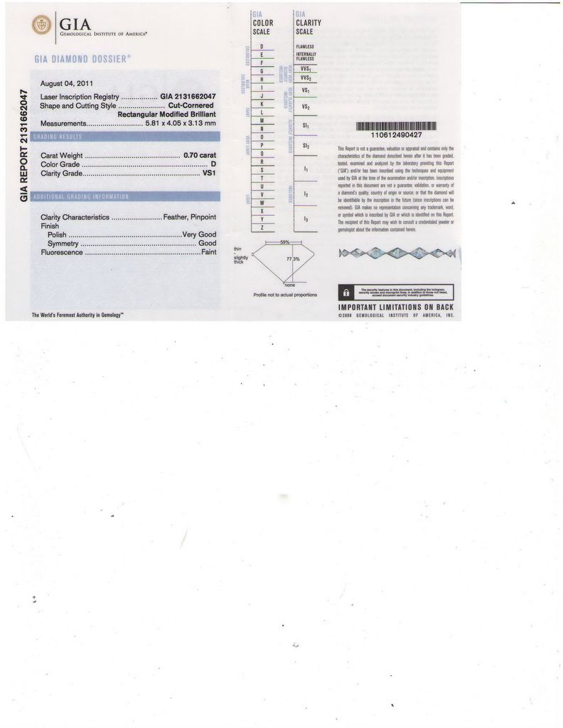 GIA CERTIFIED Radiant 0.70 Carat D,VS1 **|**|** Shape: Radiant ; CTW: 0.7 ; Color: D ; Clarity: VS1 ; Sym: VG ; Flour: G ; Meas: 5.81x4.05x3.13 ; Certification: GIA ; Table: 77.3 ; Girth: 59 ; MSRP: $7000