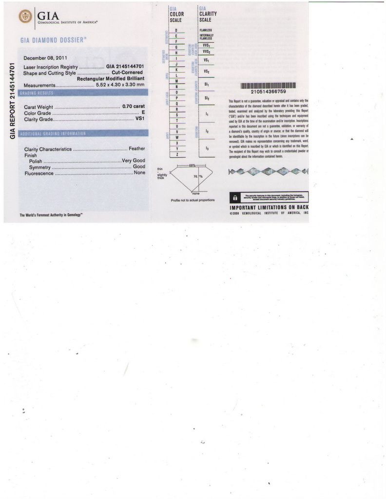 GIA CERTIFIED Radiant 0.70 Carat E,VS1 **|**|** Shape: Radiant ; CTW: 0.7 ; Color: E ; Clarity: VS1 ; Sym: VG ; Flour: G ; Meas: 5.52x4.30x3.30 ; Certification: GIA ; Table: 76.7 ; Girth: 68 ; MSRP: $6400