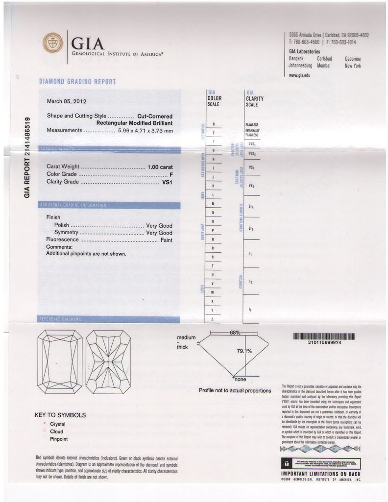 GIA CERTIFIED Radiant 1.0 Carat F,VS1 **|**|** Shape: Radiant ; CTW: 1 ; Color: F ; Clarity: VS1 ; Sym: VG ; Flour: VG ; Meas: 5.96x4.71x3.73 ; Certification: GIA ; Table: 79.1 ; Girth: 68 ; MSRP: $12800
