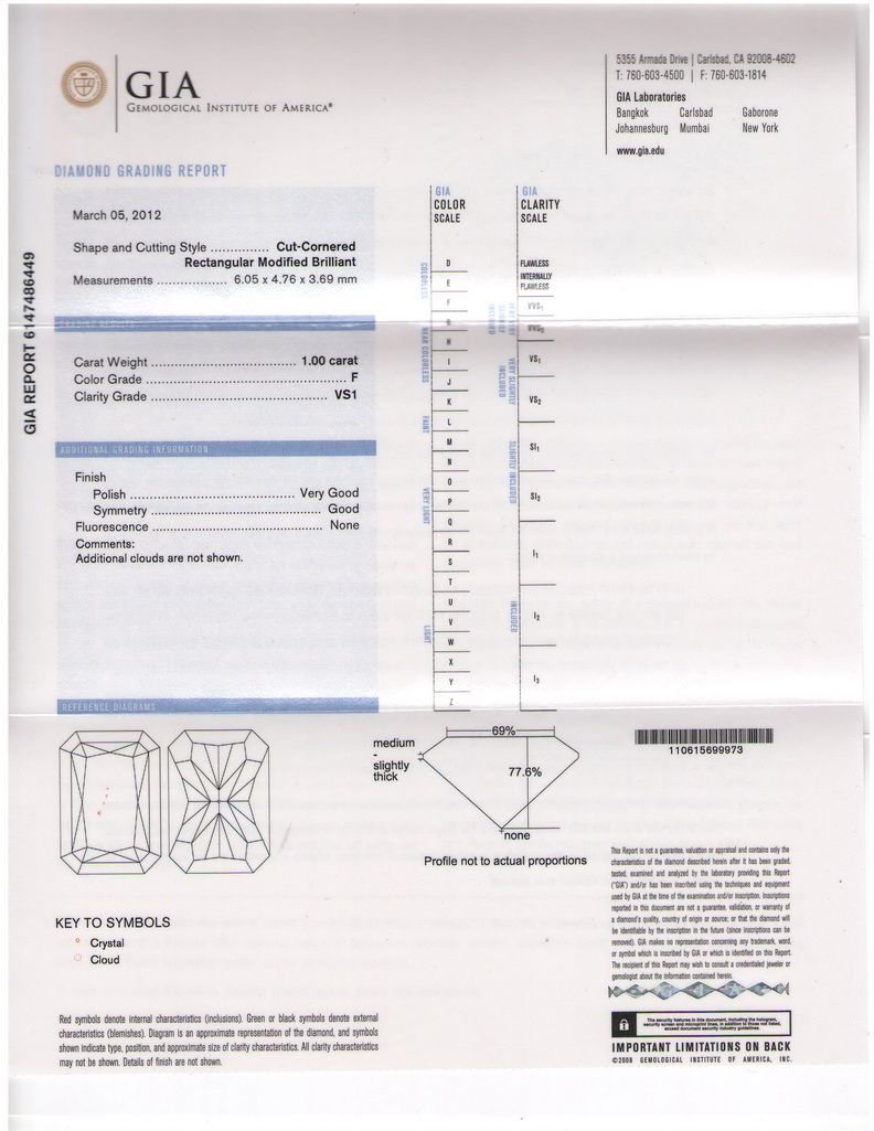 GIA CERTIFIED Radiant 1.0 Carat F,VS1 **|**|** Shape: Radiant ; CTW: 1 ; Color: F ; Clarity: VS1 ; Sym: VG ; Flour: G ; Meas: 6.05x4.76x3.69 ; Certification: GIA ; Table: 77.6 ; Girth: 69 ; MSRP: $12800
