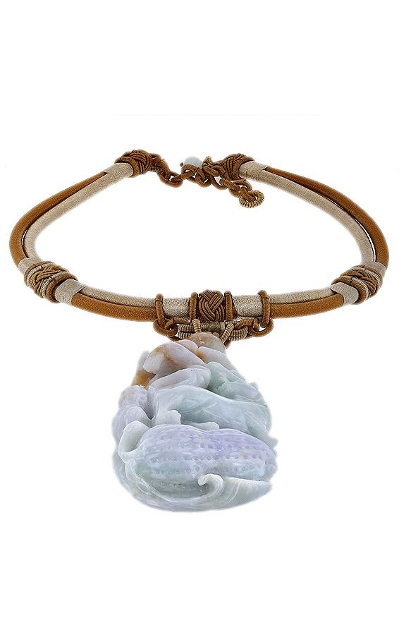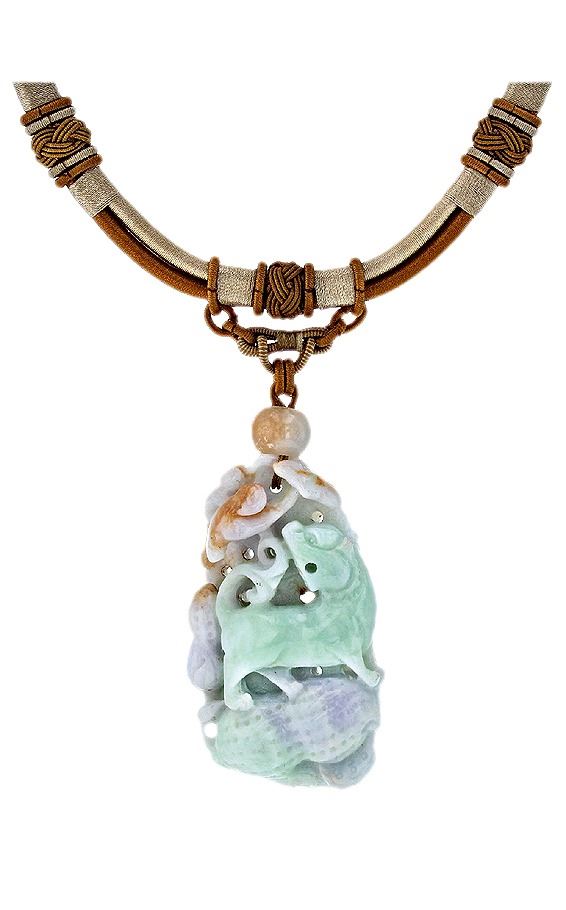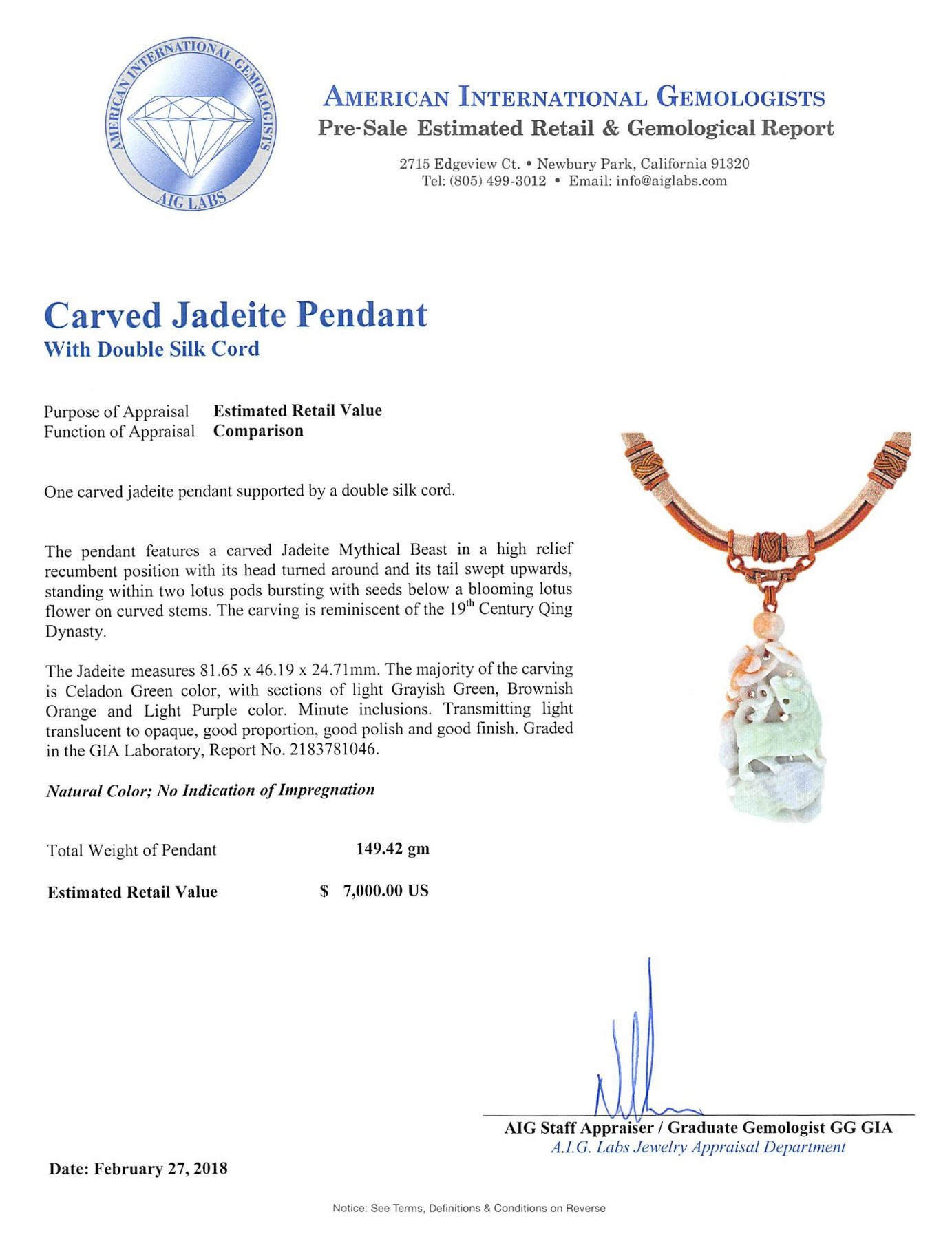 One GIA Carved Jadeite Pendant. One carved jadeite pendant supported by a double silk cord. The pendant features a carved Jadeite Mythical Beast in a high relief recumbent position with its head turned around and its tail swept upwards, standing within two lotus pods bursting with seeds below a blooming lotus flower on curved stems. The carving is reminiscent of the 19th Century Qing Dynasty. The Jadeite measures 81.65 x 46.19 x 24.71mm. The majority of the carving is Celadon Green color, with sections of light Grayish Green, Brownish Orange and Light Purple color. Minute inclusions. Transmitting light translucent to opaque, good proportion, good polish and good finish. Graded in the GIA Laboratory, Report No. 2183781046. Natural Color; No Indication of Impregnation. Total Weight of Pendant 149.42gm.