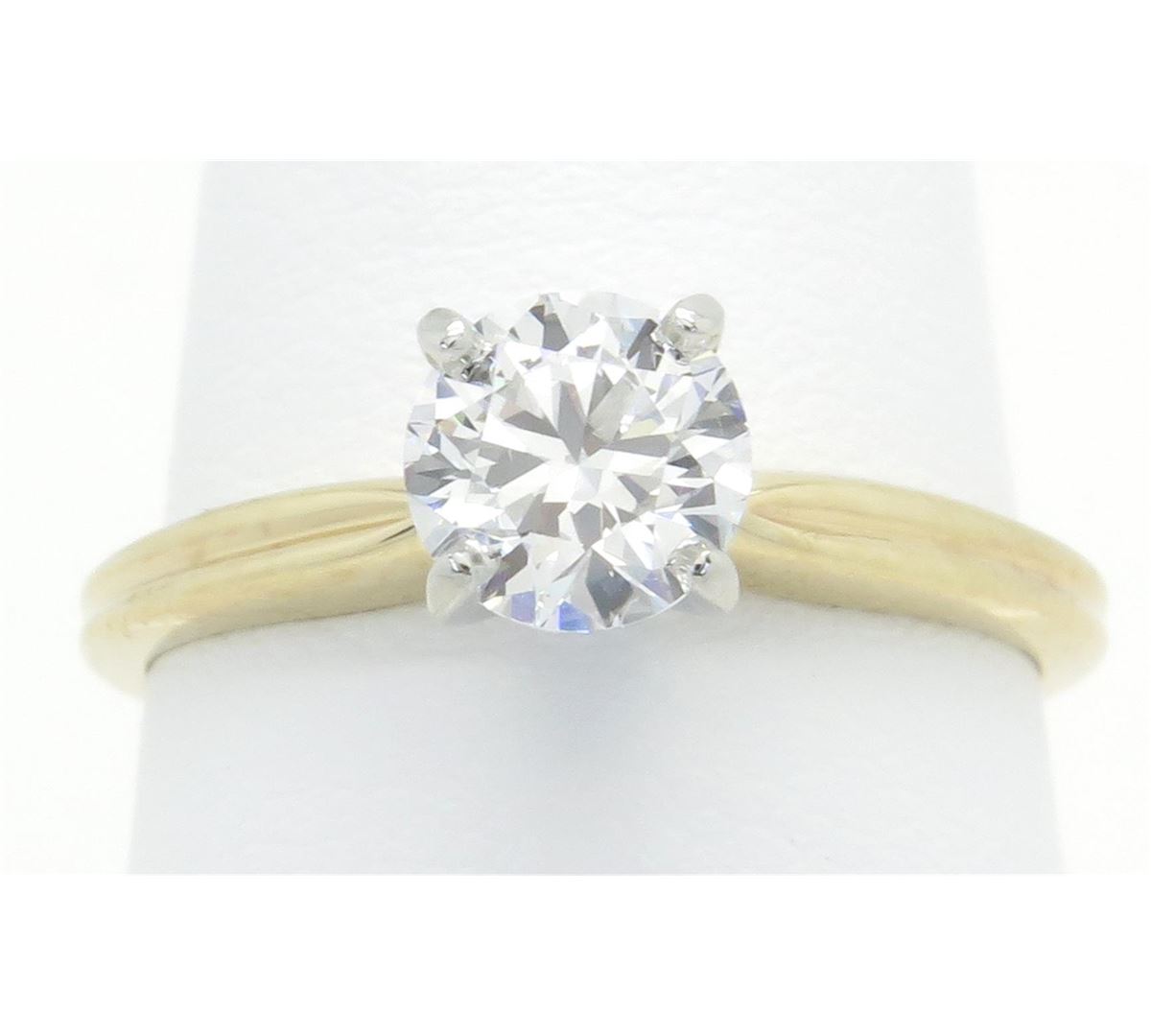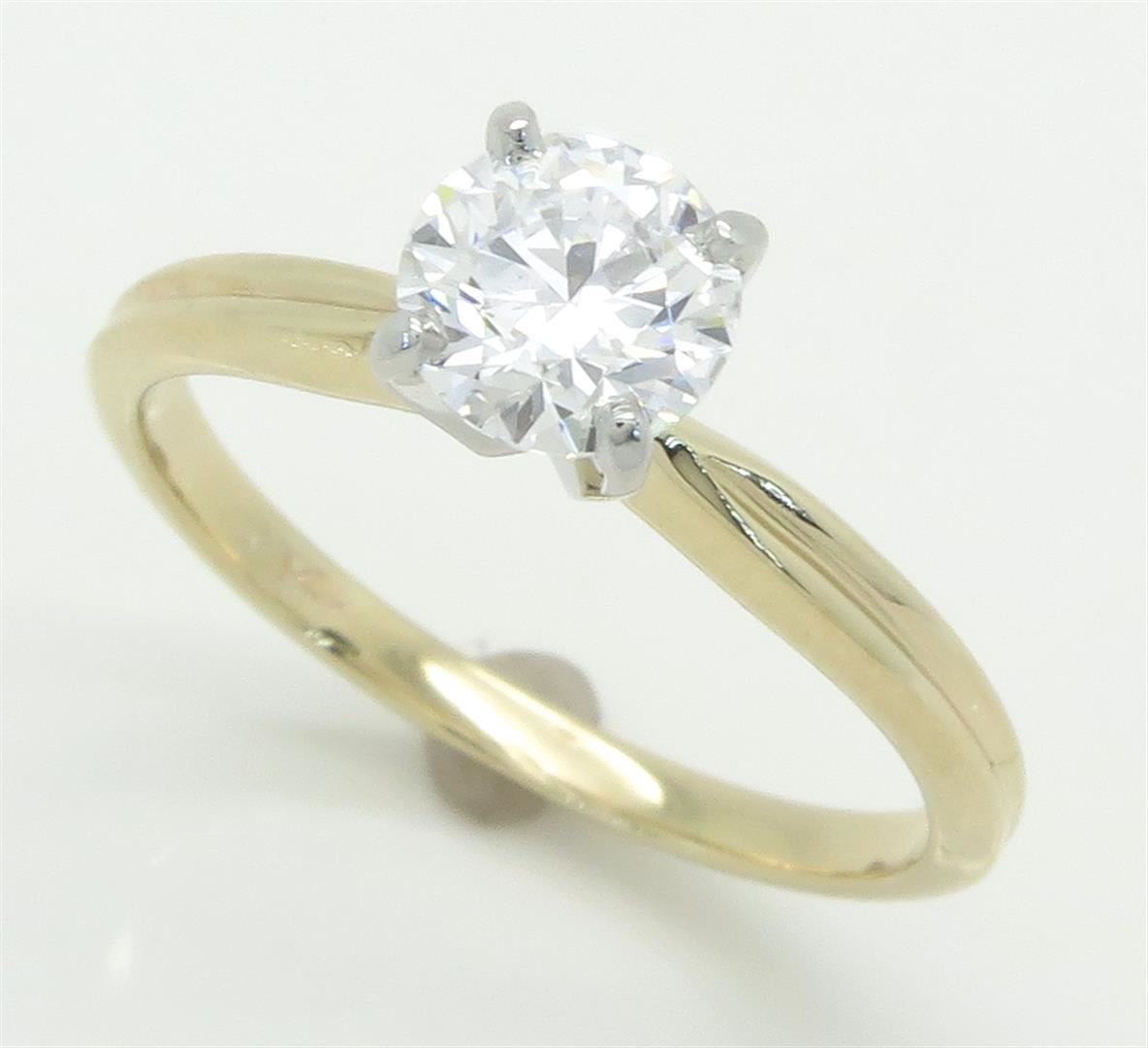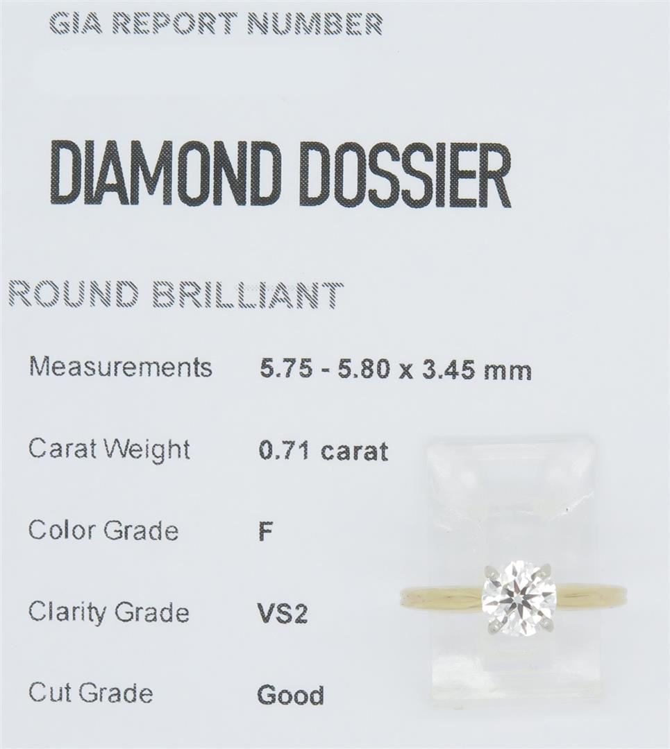 One tested 14K yellow gold diamond ring. Containing: One GIA Certified Round Brilliant Cut Diamond. Size: .71CT, Clarity: VS, Color: F. All diamonds are graded in the mounting unless otherwise stated. Weight of ring: 2.4 grams, Size: 5.0. GIA Appraised.