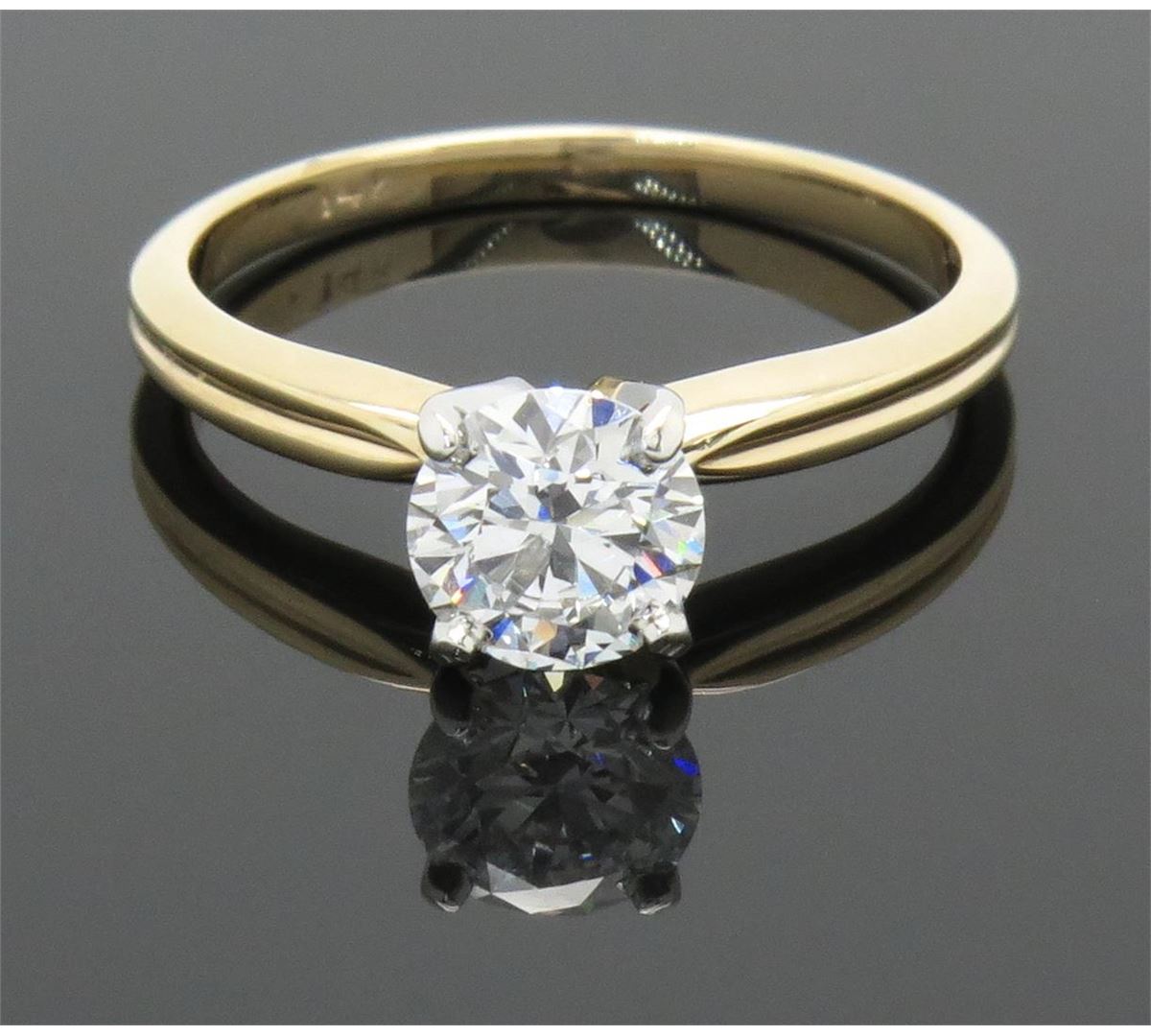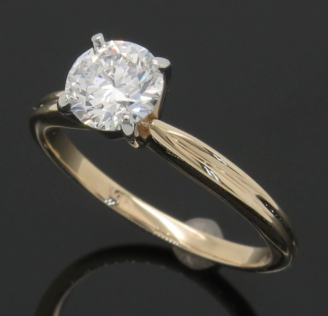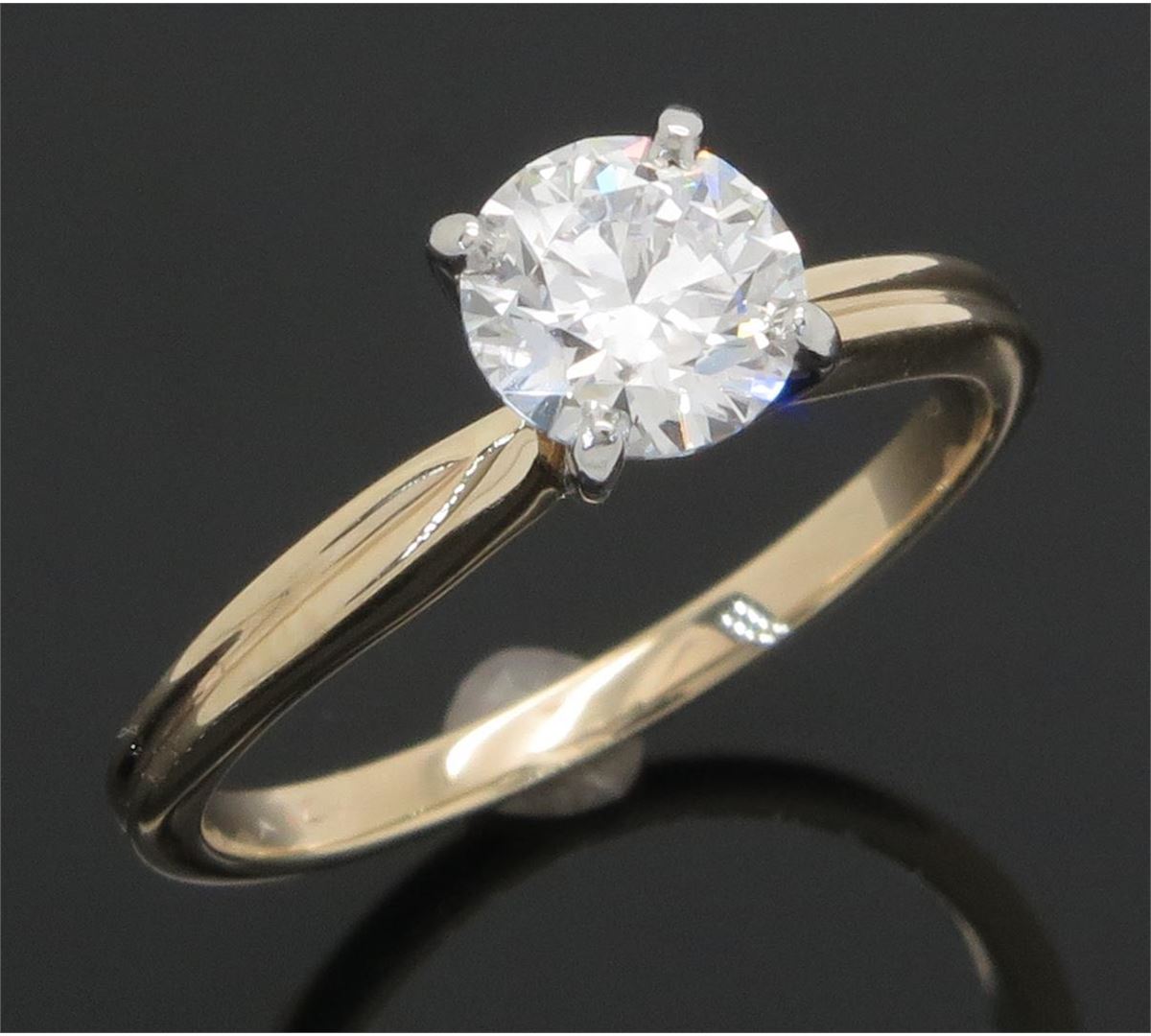 One tested 14K yellow gold diamond ring. Containing: One GIA Certified Round Brilliant Cut Diamond. Size: .71CT, Clarity: VS, Color: F. All diamonds are graded in the mounting unless otherwise stated. Weight of ring: 2.4 grams, Size: 5.0. GIA Appraised.
