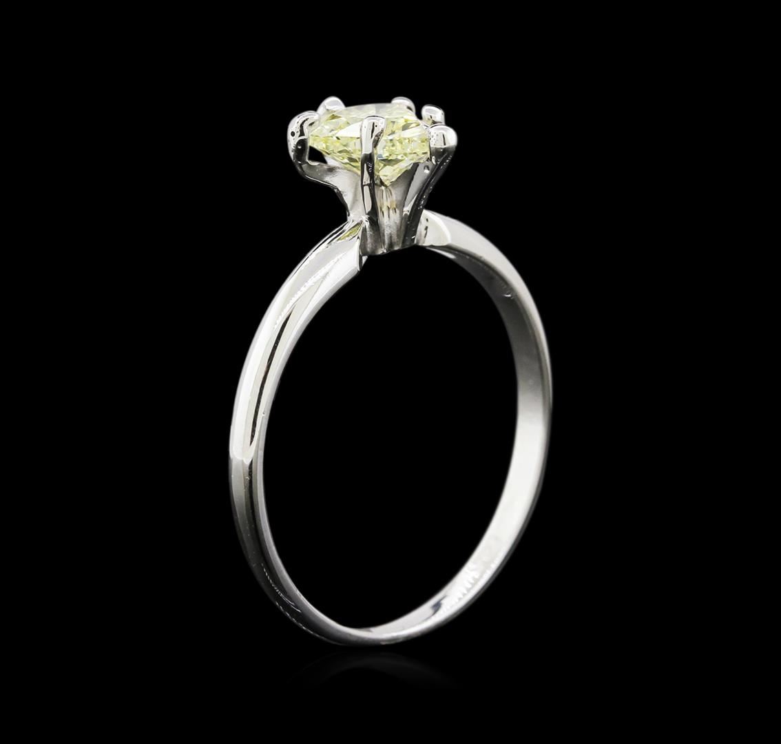 One electronically tested 14KT white gold lady's combination cast & assembled solitaire engagement ring with a bright polish finish. The featured lady's ring has a shank measuring 1.60 millimeters in width. Identified with markings of "14K". Condition is new, good workmanship. Containing: One pear shaped cut diamond, measuring 6.61 x 5.80 x 3.28mm (depth est.) approximate weight of 0.74ct. Graded loose prior to setting in the GIA Laboratory, Report #2141895629. Clarity: SI-2. Color: W - X. Total Weight of Diamonds 0.74ct. Total Weight of Ring 2.20gm. GAS Appraised at $3,670.00.