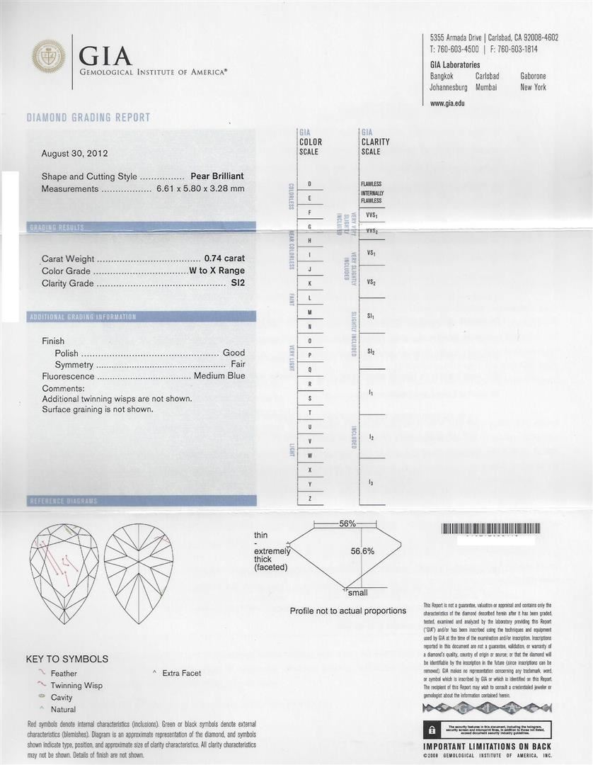 One electronically tested 14KT white gold lady's combination cast & assembled solitaire engagement ring with a bright polish finish. The featured lady's ring has a shank measuring 1.60 millimeters in width. Identified with markings of "14K". Condition is new, good workmanship. Containing: One pear shaped cut diamond, measuring 6.61 x 5.80 x 3.28mm (depth est.) approximate weight of 0.74ct. Graded loose prior to setting in the GIA Laboratory, Report #2141895629. Clarity: SI-2. Color: W - X. Total Weight of Diamonds 0.74ct. Total Weight of Ring 2.20gm. GAS Appraised at $3,670.00.