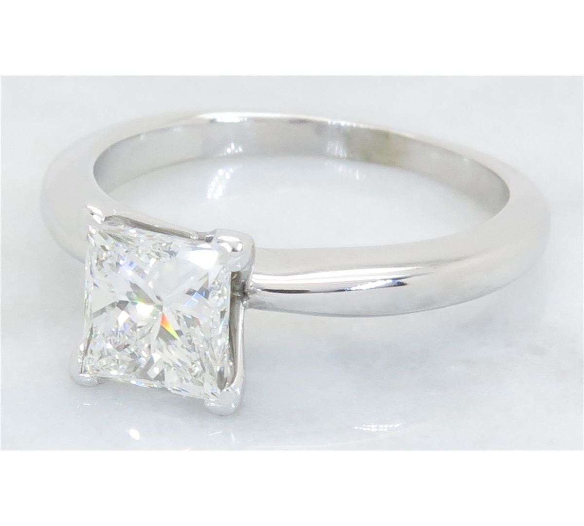 One tested 14K white gold certified diamond ring. Containing: One GIA Certified Princess Cut Diamond. Size: 1.01CT, Clarity: VS2, Color: G. All diamonds are graded in the mounting unless otherwise stated. Weight of ring: 2.9 grams, Size: 4.5 GIA Appraised.
