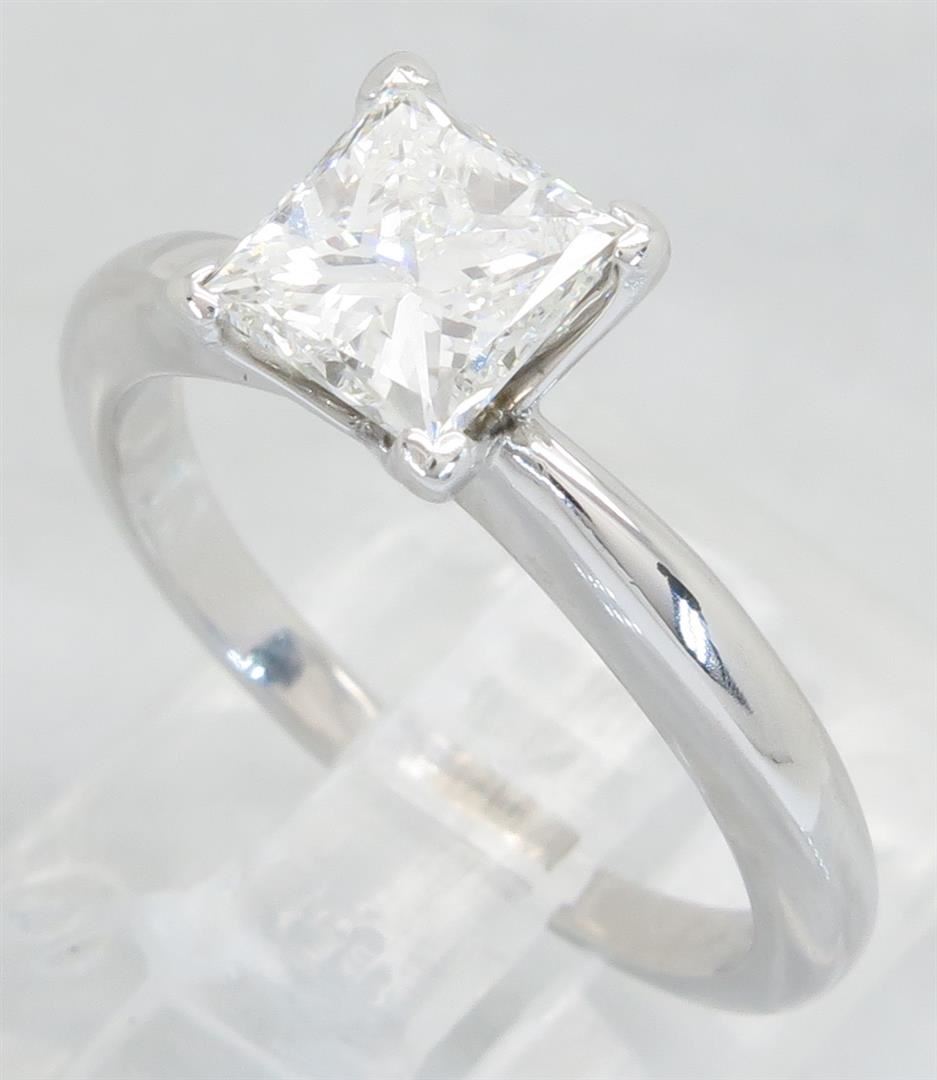 One tested 14K white gold certified diamond ring. Containing: One GIA Certified Princess Cut Diamond. Size: 1.01CT, Clarity: VS2, Color: G. All diamonds are graded in the mounting unless otherwise stated. Weight of ring: 2.9 grams, Size: 4.5 GIA Appraised.