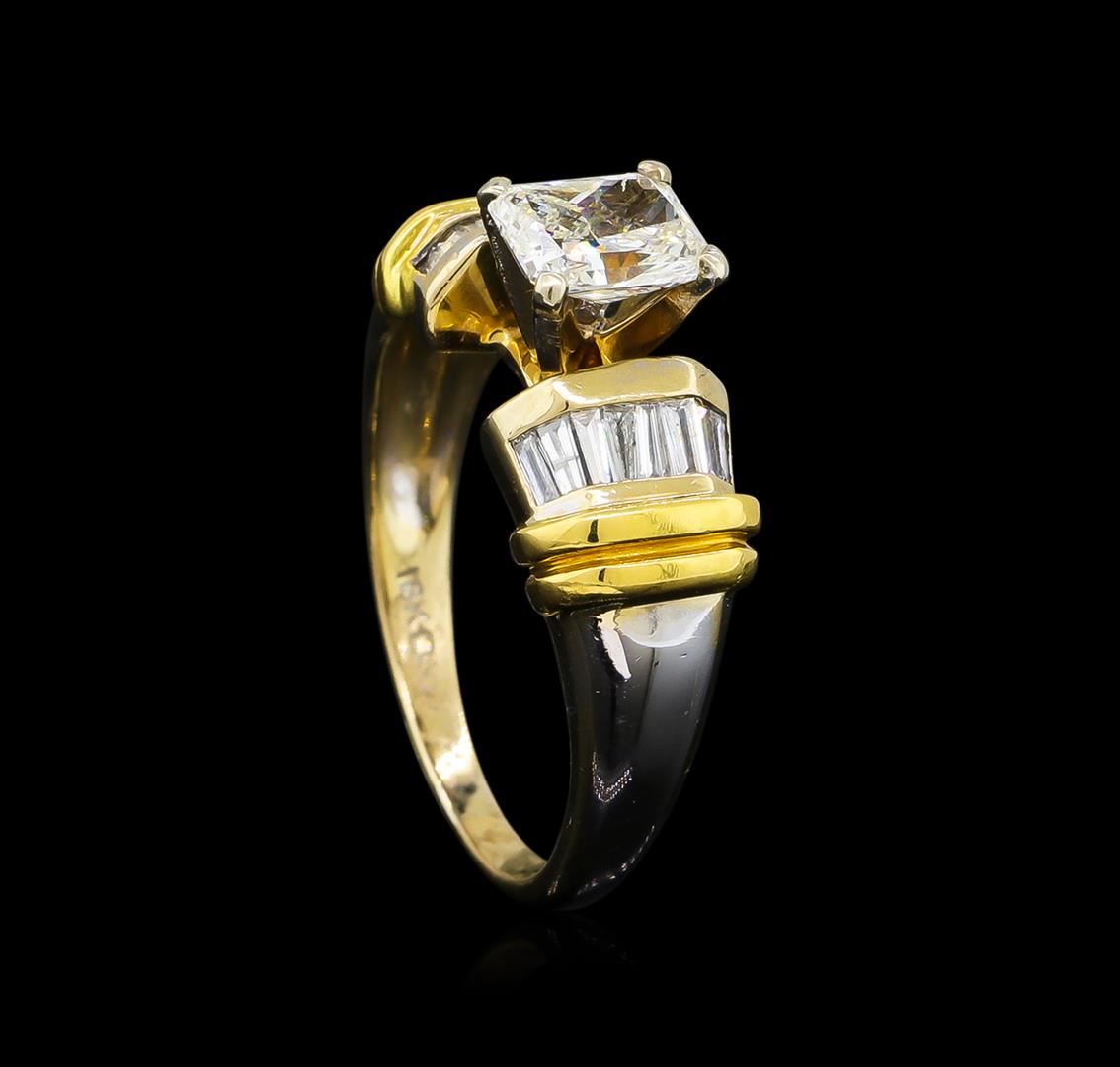 One electronically tested 18KT white gold ladies cast & assembled diamond unity ring. The featured diamond is set between mirroring diamond ribbons supported by stylized tapering shoulders, completed by a two millimeter wide band. Bright polish finish with yellow gold accents. Identified with markings of "18K". Condition is good. Containing: One prong set Cut-cornered rectangular modified brilliant cut diamond, measuring 6.42 x 5.18 x 3.30mm exact weight 0.91ct with a strong blue fluorescence. Graded loose prior to setting in GIA laboratory. GIA Diamond Dossier Report attached. GIA Report # 11005892. Clarity: SI-1. Color: J. Depth 63.7%. Table 70.0%. Sixteen channel set baguette cut (tapered) diamonds, measuring from 2.50 x 1.00 x 0.70mm (depth est.) to 2.70 x 1.20 x 0.84mm (depth est.) approximate total weight of 16 Stones = 0.35ct. Graded in the setting. Clarity: SI-1 to I-1. Color: F - H. Total Weight of Diamonds 1.26ct. Total Weight of Ring 5.85gm. AIG Appraised at $9,700.00.