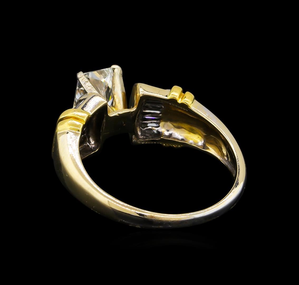 One electronically tested 18KT white gold ladies cast & assembled diamond unity ring. The featured diamond is set between mirroring diamond ribbons supported by stylized tapering shoulders, completed by a two millimeter wide band. Bright polish finish with yellow gold accents. Identified with markings of "18K". Condition is good. Containing: One prong set Cut-cornered rectangular modified brilliant cut diamond, measuring 6.42 x 5.18 x 3.30mm exact weight 0.91ct with a strong blue fluorescence. Graded loose prior to setting in GIA laboratory. GIA Diamond Dossier Report attached. GIA Report # 11005892. Clarity: SI-1. Color: J. Depth 63.7%. Table 70.0%. Sixteen channel set baguette cut (tapered) diamonds, measuring from 2.50 x 1.00 x 0.70mm (depth est.) to 2.70 x 1.20 x 0.84mm (depth est.) approximate total weight of 16 Stones = 0.35ct. Graded in the setting. Clarity: SI-1 to I-1. Color: F - H. Total Weight of Diamonds 1.26ct. Total Weight of Ring 5.85gm. AIG Appraised at $9,700.00.