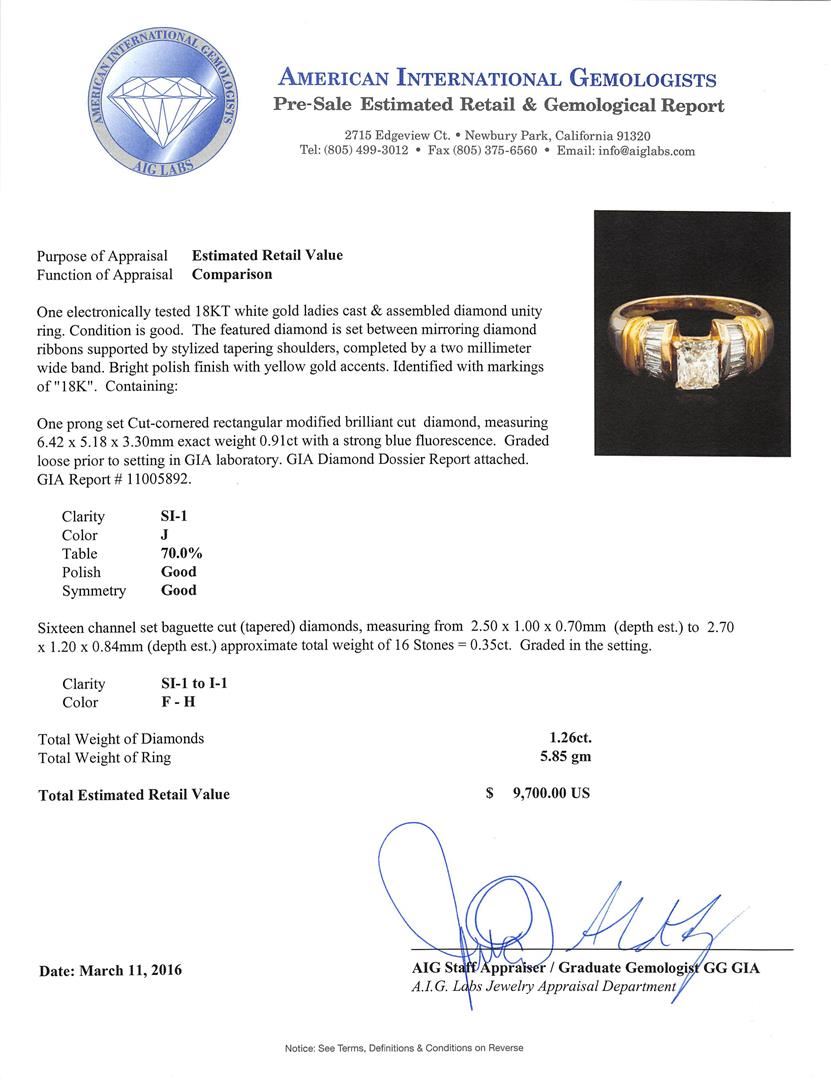 One electronically tested 18KT white gold ladies cast & assembled diamond unity ring. The featured diamond is set between mirroring diamond ribbons supported by stylized tapering shoulders, completed by a two millimeter wide band. Bright polish finish with yellow gold accents. Identified with markings of "18K". Condition is good. Containing: One prong set Cut-cornered rectangular modified brilliant cut diamond, measuring 6.42 x 5.18 x 3.30mm exact weight 0.91ct with a strong blue fluorescence. Graded loose prior to setting in GIA laboratory. GIA Diamond Dossier Report attached. GIA Report # 11005892. Clarity: SI-1. Color: J. Depth 63.7%. Table 70.0%. Sixteen channel set baguette cut (tapered) diamonds, measuring from 2.50 x 1.00 x 0.70mm (depth est.) to 2.70 x 1.20 x 0.84mm (depth est.) approximate total weight of 16 Stones = 0.35ct. Graded in the setting. Clarity: SI-1 to I-1. Color: F - H. Total Weight of Diamonds 1.26ct. Total Weight of Ring 5.85gm. AIG Appraised at $9,700.00.