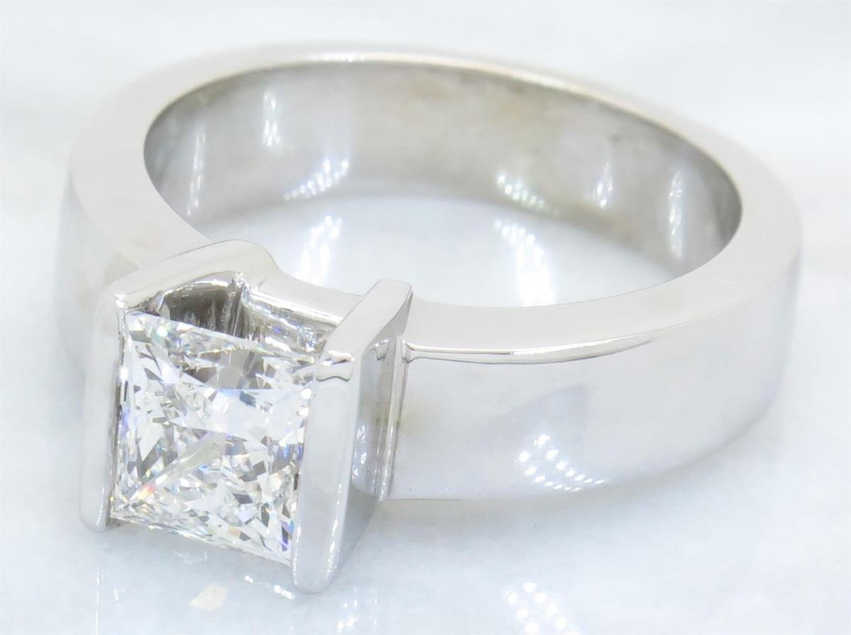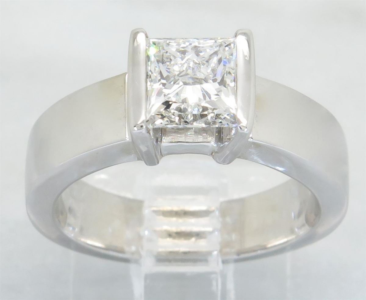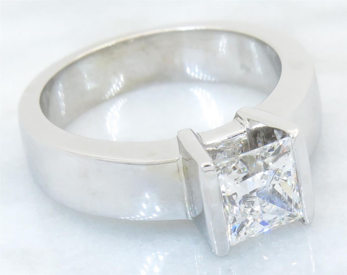 One tested 14K white gold diamond ring. Containing: One GIA Certified Princess Cut Diamond. Size: 1.29CT, Clarity: VS1, Color: D. All diamonds are graded in the mounting unless otherwise stated. Weight of ring: 7.9 grams, Size: 5.5. GIA Appraised.