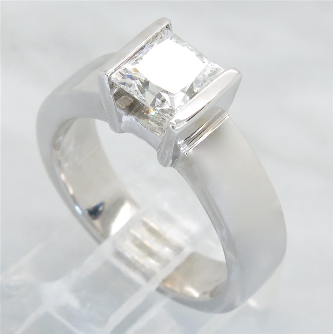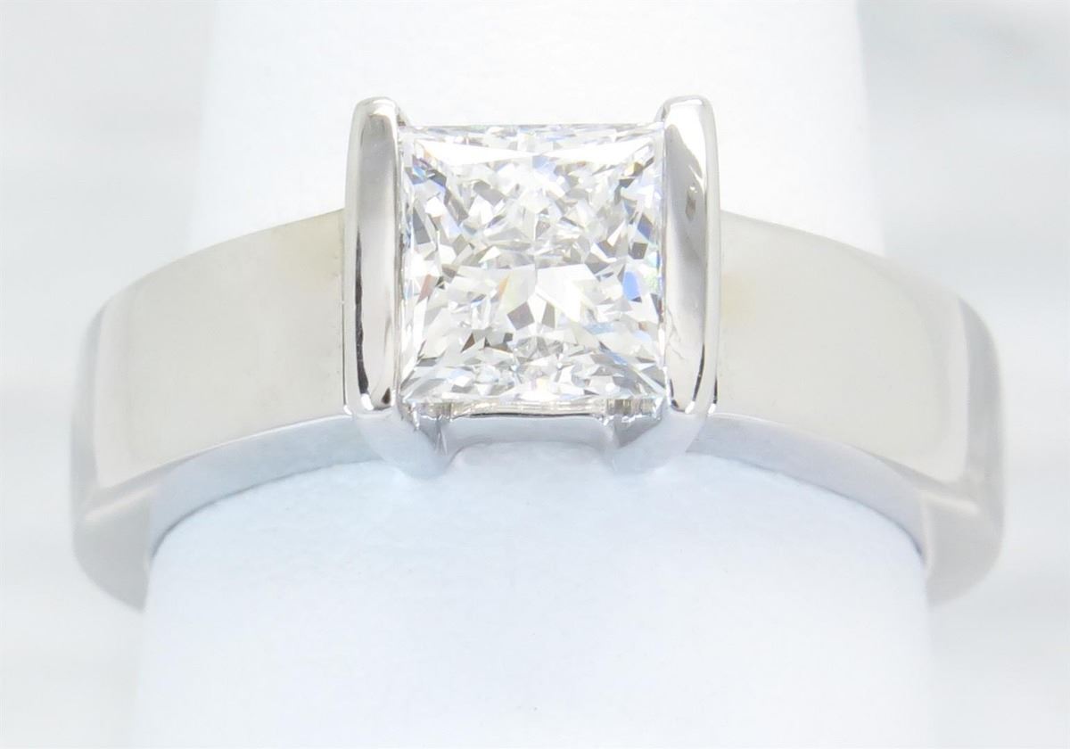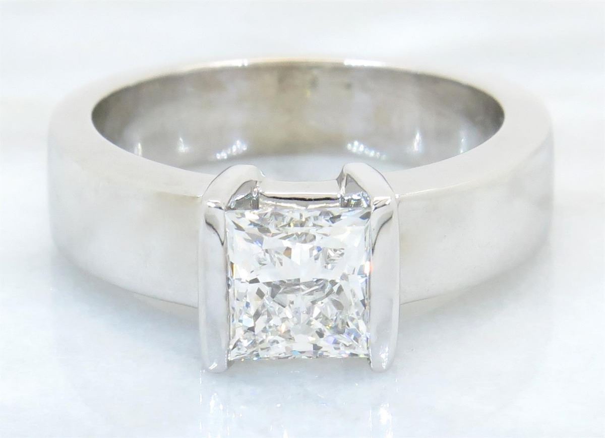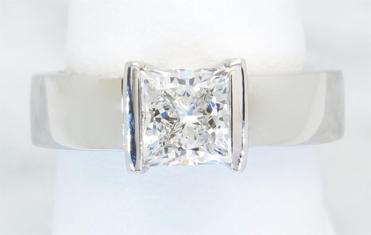 One tested 14K white gold diamond ring. Containing: One GIA Certified Princess Cut Diamond. Size: 1.29CT, Clarity: VS1, Color: D. All diamonds are graded in the mounting unless otherwise stated. Weight of ring: 7.9 grams, Size: 5.5. GIA Appraised.