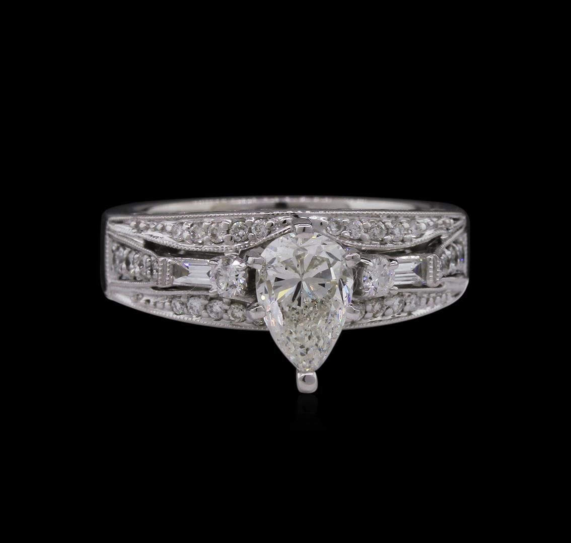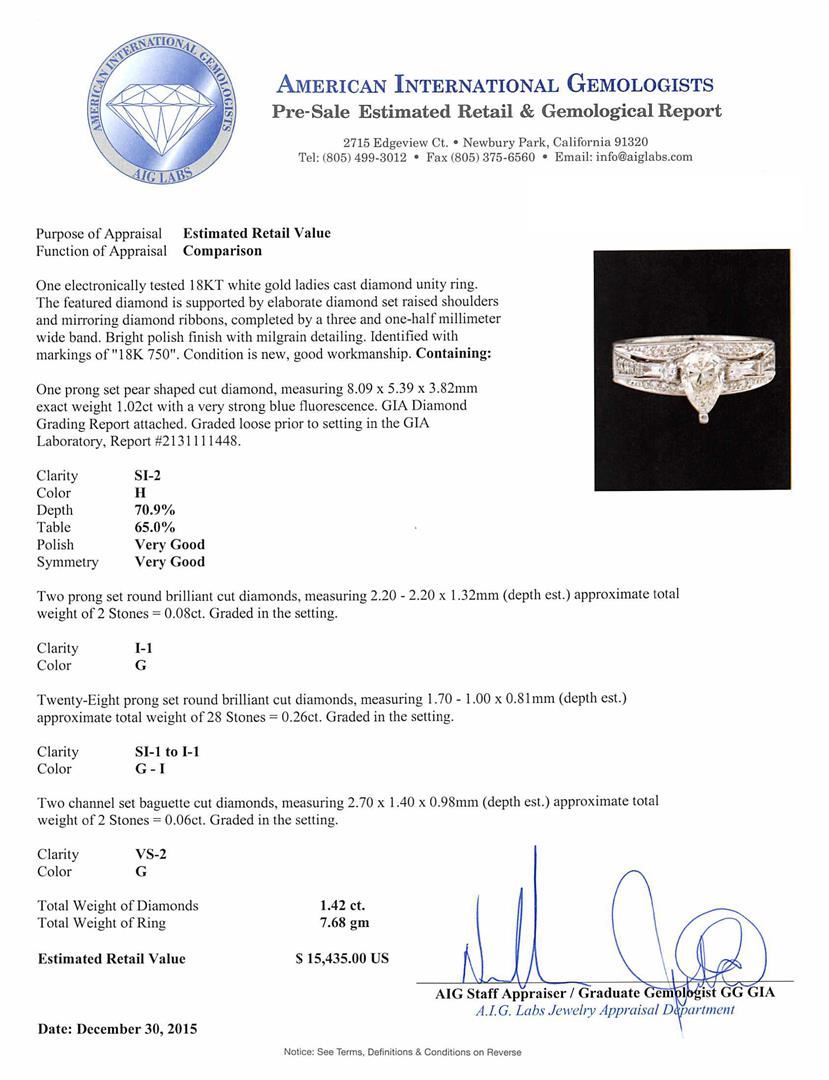 One electronically tested 18KT white gold ladies cast diamond unity ring. The featured diamond is supported by elaborate diamond set raised shoulders and mirroring diamond ribbons, completed by a three and one-half millimeter wide band. Bright polish finish with milgrain detailing. Identified with markings of "18K 750". Condition is new, good workmanship. Containing: One prong set pear shaped cut diamond, measuring 8.09 x 5.39 x 3.82mm exact weight 1.02ct with a very strong blue fluorescence. GIA Diamond Grading Report attached. Graded loose prior to setting in the GIA Laboratory, Report #2131111448. Clarity: SI-2. Color: H. Depth 70.9%. Table 65.0%. Two prong set round brilliant cut diamonds, measuring 2.20 - 2.20 x 1.32mm (depth est.) approximate total weight of 2 Stones = 0.08ct. Graded in the setting. Clarity: I-1. Color: G Twenty-Eight prong set round brilliant cut diamonds, measuring 1.70 - 1.00 x 0.81mm (depth est.) approximate total weight of 28 Stones = 0.26ct. Graded in the setting. Clarity: SI-1 to I-1. Color: G - I Two channel set baguette cut diamonds, measuring 2.70 x 1.40 x 0.98mm (depth est.) approximate total weight of 2 Stones = 0.06ct. Graded in the setting. Clarity: VS-2. Color: G. Total Weight of Diamonds 1.42ct. Total Weight of Ring 7.68gm. AIG Appraised at $15,435.00.