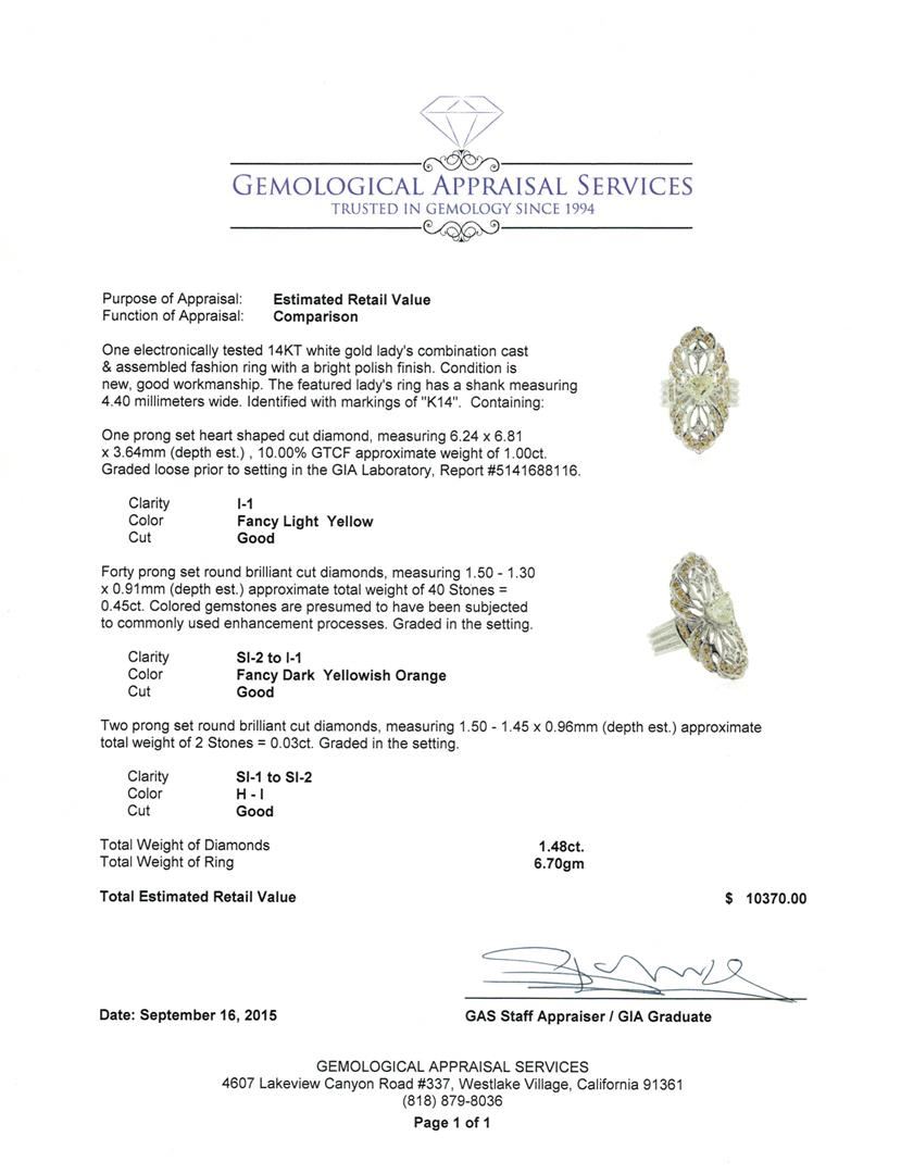 One electronically tested 14KT white gold lady's combination cast & assembled fashion ring with a bright polish finish. The featured lady's ring has a shank measuring 4.40 millimeters wide. Identified with markings of "K14". Condition is new, good workmanship. Containing: One prong set heart shaped cut diamond, measuring 6.24 x 6.81 x 3.64mm (depth est.) , 10.00.%. GTCF approximate weight of 1.00ct. Graded loose prior to setting in the GIA Laboratory, Report #5141688116. Clarity: I-1 Cut Good Forty prong set round brilliant cut diamonds, measuring 1.50 - 1.30 x 0.91mm (depth est.) approximate total weight of 40 Stones = 0.45ct. Colored gemstones are presumed to have been subjected to commonly used enhancement processes. Graded in the setting. Clarity: SI-2 to I-1 Cut Good Two prong set round brilliant cut diamonds, measuring 1.50 - 1.45 x 0.96mm (depth est.) approximate total weight of 2 Stones = 0.03ct. Graded in the setting. Clarity: SI-1 to SI-2. Color: H - I. Cut Good. Total Weight of Diamonds 1.48ct. Total Weight of Ring 6.70gm. GAS Appraised at $10,370.00.