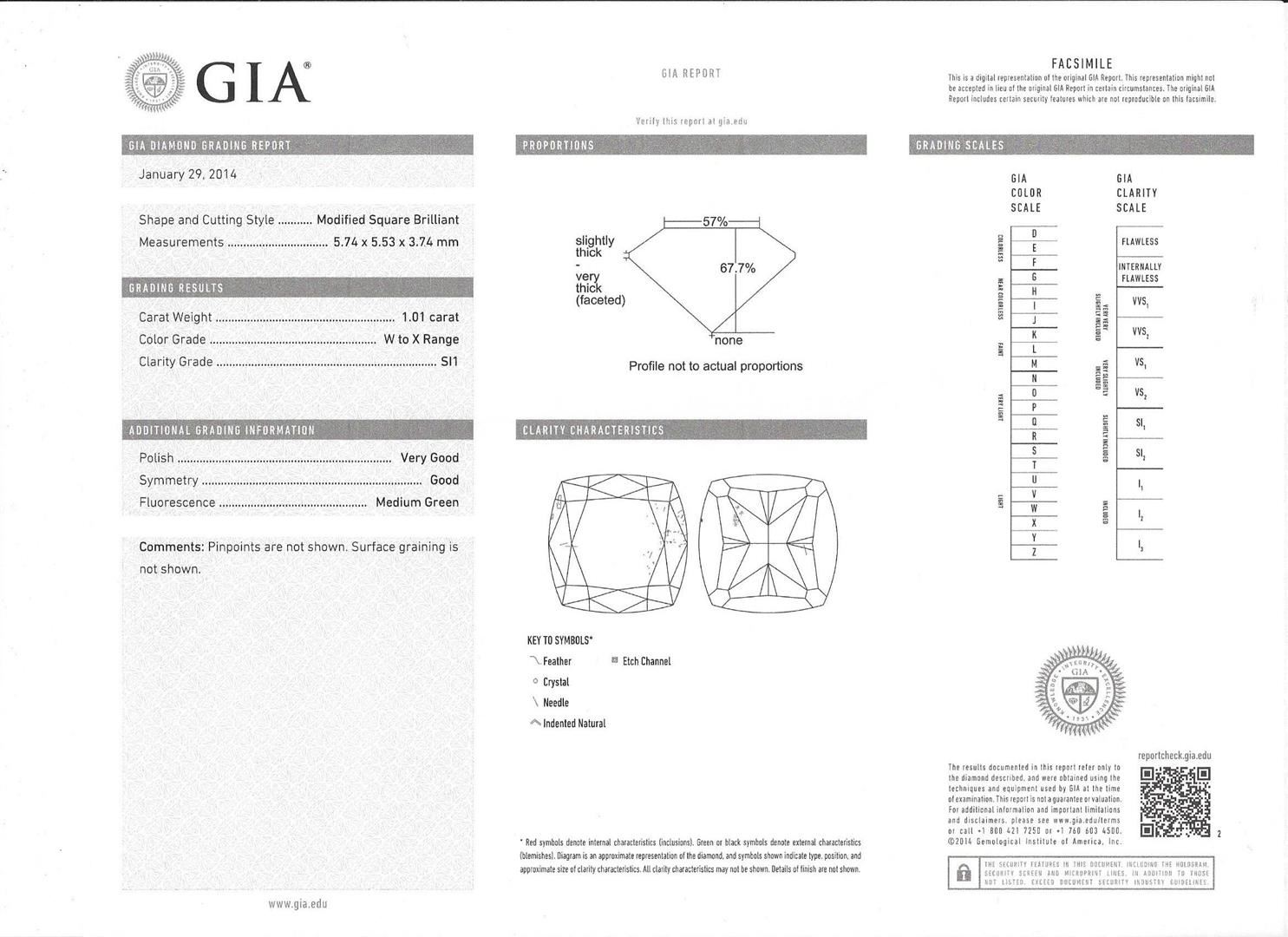 One electronically tested 14KT white and yellow gold lady's combination cast & assembled wedding ring with a split shank halo with a bright polish finish. The featured lady's ring has a double shank measuring 3.51 millimeters wide. Identified with markings of "14K". Condition is new, good workmanship. Containing: One prong set cushion cut diamond, measuring 5.74 x 5.53 x 3.74mm (depth est.) , 5.00% GTCF approximate weight of 1.01ct. GIA Gem Trade Laboratory Report # 5166712763. Clarity: SI-1. Color: W - X. Cut: Very Good. Sixty prong set round brilliant cut diamonds, measuring 1.35 - 1.25 x 0.81mm (depth est.) approximate total weight of 60 Stones = 0.50ct. Graded in the setting. Clarity: SI-1 to I-1. Color: G - I. Cut: Good. Total Weight of Diamonds 1.51ct. Total Weight of Ring 6.00gm. GAS Appraised at $8,100.00.