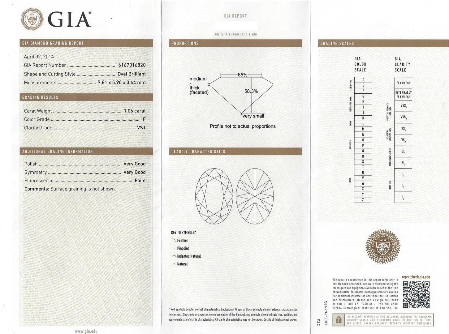 One electronically tested 18KT white gold lady's combination cast & assembled wedding ring with a knife edge shank with a bright polish with milgrain detailing finish. The featured lady's ring has a shank measuring 2.35 millimeters wide. Identified with markings of "18K 750". Condition is new, good workmanship. Containing: One prong set oval shaped cut diamond, measuring 7.81 x 5.90 x 3.44mm (depth est.) , 5.00.%. GTCF approximate weight of 1.06ct. Graded loose prior to setting in the GIA Laboratory, Report #6167016820. Clarity: VS-1. Color: F. Cut Very Good Two prong set round brilliant cut diamonds, measuring 2.20 - 2.15 x 1.42mm (depth est.) approximate total weight of 2 Stones = 0.08ct. Graded in the setting. Clarity: SI-1. Color: G - H. Cut Very Good Two prong set round brilliant cut diamonds, measuring 1.50 - 1.45 x 0.96mm (depth est.) approximate total weight of 2 Stones = 0.03ct. Graded in the setting. Clarity: SI-1. Color: Good Fifty-Six bead set round brilliant cut diamonds, measuring 1.40 - 1.10 x 0.75mm (depth est.) approximate total weight of 56 Stones = 0.34ct. Graded in the setting. Clarity: SI-1 to I-1. Color: H - I. Cut Good. Total Weight of Diamonds 1.51ct. Total Weight of Ring 5.10gm. GAS Appraised at $21,295.00.