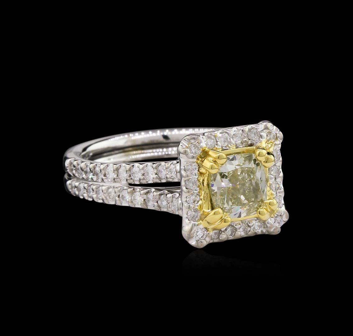 One electronically tested 14KT white and yellow gold lady's combination cast & assembled wedding ring with a split shank halo with a bright polish finish. The featured lady's ring has a double shank measuring 3.51 millimeters wide. Identified with markings of "14K". Condition is new, good workmanship. Containing: One prong set cushion cut diamond, measuring 5.74 x 5.53 x 3.74mm (depth est.) , 5.00% GTCF approximate weight of 1.01ct. GIA Gem Trade Laboratory Report # 5166712763. Clarity: SI-1. Color: W - X. Cut: Very Good. Sixty prong set round brilliant cut diamonds, measuring 1.35 - 1.25 x 0.81mm (depth est.) approximate total weight of 60 Stones = 0.50ct. Graded in the setting. Clarity: SI-1 to I-1. Color: G - I. Cut: Good. Total Weight of Diamonds 1.51ct. Total Weight of Ring 6.00gm. GAS Appraised at $8,100.00.