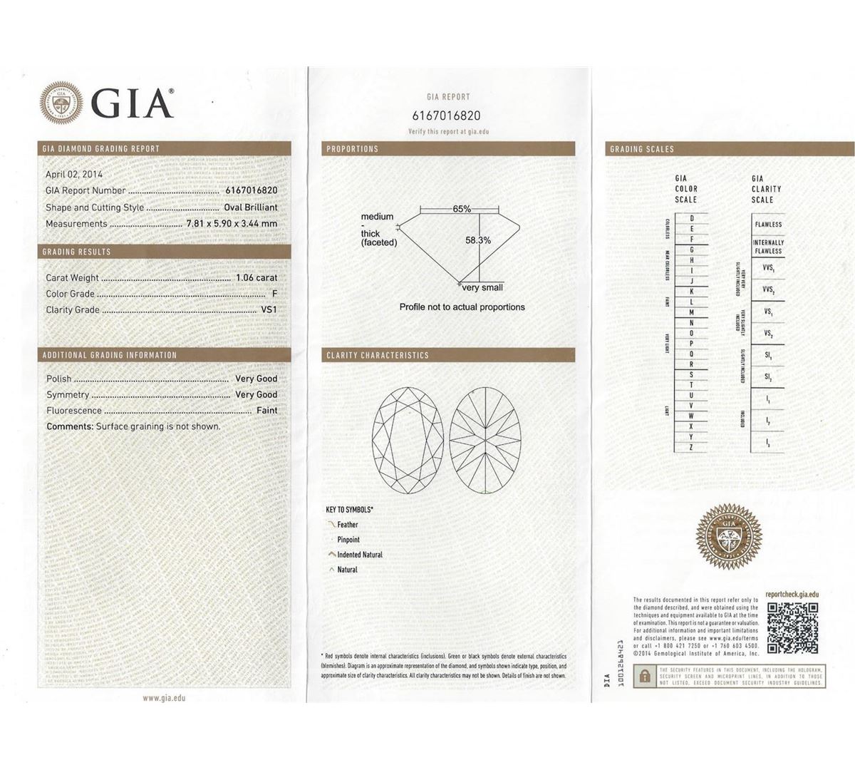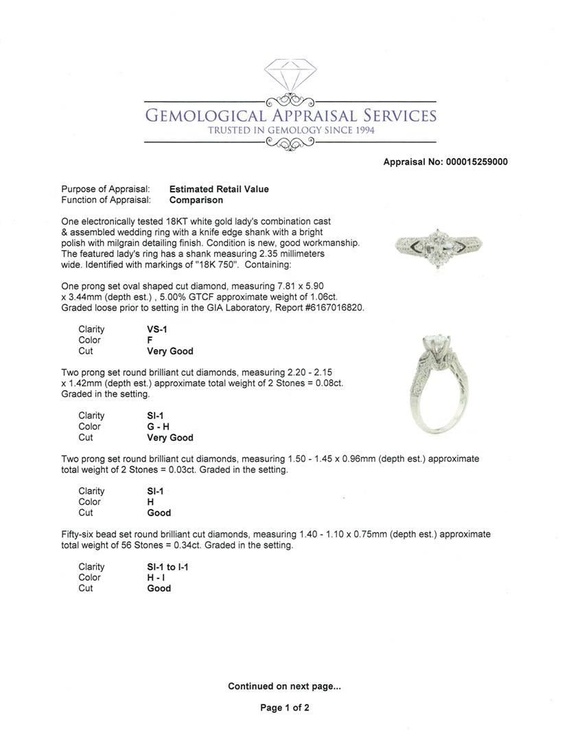 One electronically tested 18KT white gold lady's combination cast & assembled wedding ring with a knife edge shank with a bright polish with milgrain detailing finish. The featured lady's ring has a shank measuring 2.35 millimeters wide. Identified with markings of "18K 750". Condition is new, good workmanship. Containing: One prong set oval shaped cut diamond, measuring 7.81 x 5.90 x 3.44mm (depth est.) , 5.00.%. GTCF approximate weight of 1.06ct. Graded loose prior to setting in the GIA Laboratory, Report #6167016820. Clarity: VS-1. Color: F. Cut Very Good Two prong set round brilliant cut diamonds, measuring 2.20 - 2.15 x 1.42mm (depth est.) approximate total weight of 2 Stones = 0.08ct. Graded in the setting. Clarity: SI-1. Color: G - H. Cut Very Good Two prong set round brilliant cut diamonds, measuring 1.50 - 1.45 x 0.96mm (depth est.) approximate total weight of 2 Stones = 0.03ct. Graded in the setting. Clarity: SI-1. Color: Good Fifty-Six bead set round brilliant cut diamonds, measuring 1.40 - 1.10 x 0.75mm (depth est.) approximate total weight of 56 Stones = 0.34ct. Graded in the setting. Clarity: SI-1 to I-1. Color: H - I. Cut Good. Total Weight of Diamonds 1.51ct. Total Weight of Ring 5.10gm. GAS Appraised at $21,295.00.