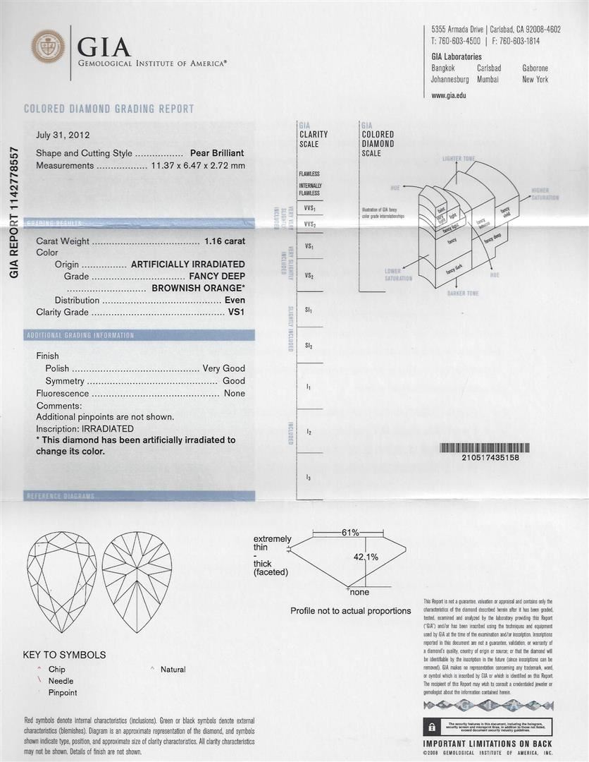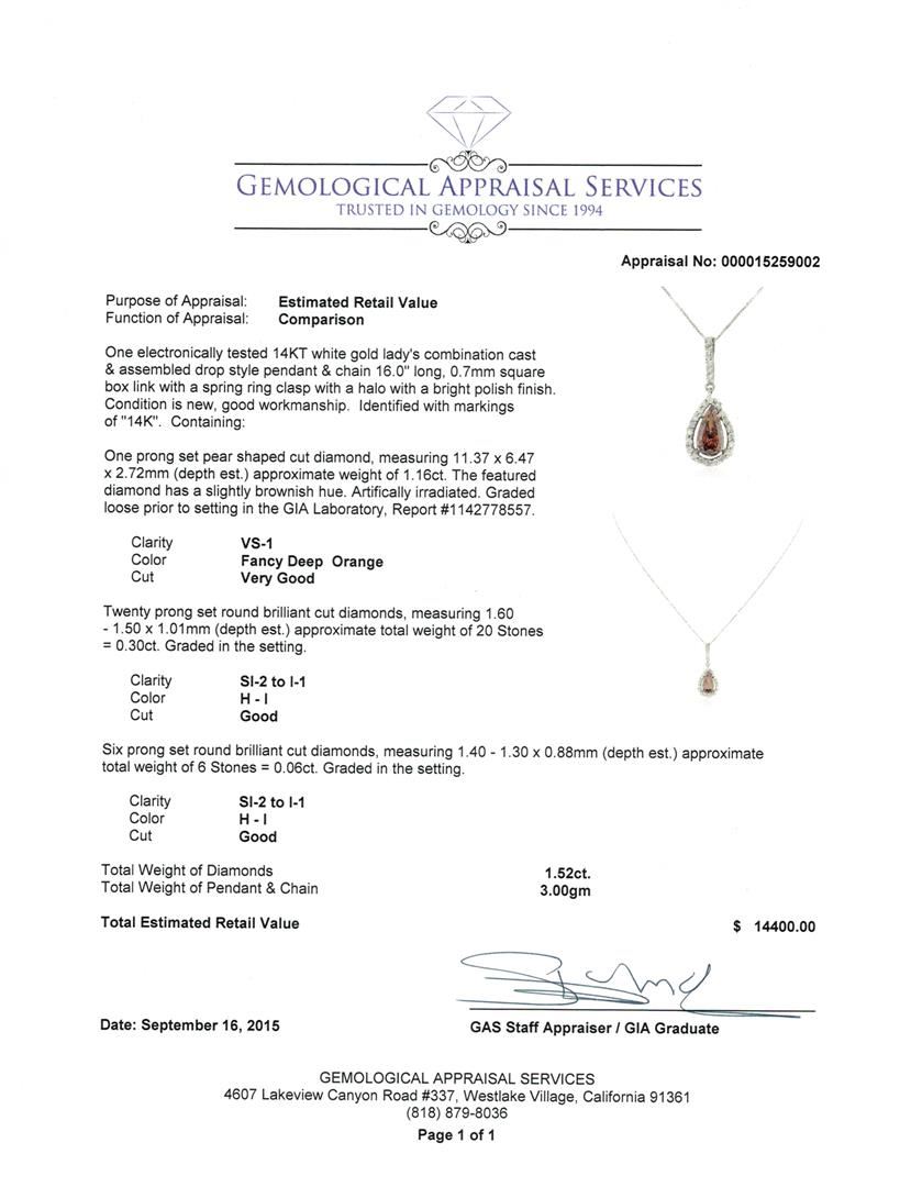One electronically tested 14KT white gold lady's combination cast & assembled drop style pendant & chain 16.0" long, 0.7mm square box link with a spring ring clasp with a halo with a bright polish finish. Identified with markings of "14K". Condition is new, good workmanship. Containing: One prong set pear shaped cut diamond, measuring 11.37 x 6.47 x 2.72mm (depth est.) approximate weight of 1.16ct. The featured diamond has a slightly brownish hue. Artificially irradiated. Graded loose prior to setting in the GIA Laboratory, Report #1142778557. Clarity: VS-1 Cut Very Good Twenty prong set round brilliant cut diamonds, measuring 1.60 - 1.50 x 1.01mm (depth est.) approximate total weight of 20 Stones = 0.30ct. Graded in the setting. Clarity: SI-2 to I-1. Color: H - I. Cut Good Six prong set round brilliant cut diamonds, measuring 1.40 - 1.30 x 0.88mm (depth est.) approximate total weight of 6 Stones = 0.06ct. Graded in the setting. Clarity: SI-2 to I-1. Color: H - I. Cut Good. Total Weight of Diamonds 1.52ct. Total Weight of Pendant & Chain 3.00gm. GAS Appraised at $14,400.00.