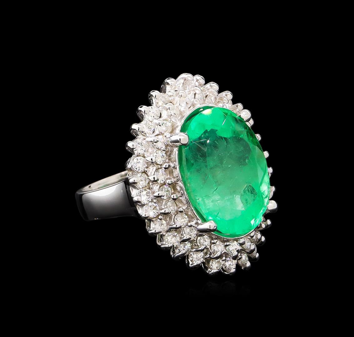 One electronically tested 14KT white gold lady's cast fashion ring with a double basket halo with a bright polish finish. The featured lady's ring has a shank measuring 3.51 millimeters wide. Identified with markings of "14K". Condition is new, good workmanship. Containing: One prong set oval modified brilliant cut natural emerald, measuring 15.27 x 11.74 x 9.79mm, exact weight 10.05ct., clarity is moderately included, type III, medium, very slightly grayish, green color, (GIA G 5/3), cut is good. Transmitting light somewhat diffusely, transparent to translucent. Naturally occurring internal & external characteristics are present. Clarity enhanced. Graded loose prior to setting in the GIA Laboratory, Report #6177501873.Thirty prong set round brilliant cut diamonds, measuring 1.90 - 1.80 x 1.15mm (depth est.) approximate total weight of 30 Stones = 0.71ct. Graded in the setting. Clarity: SI-1 to SI-2. Color: G - Good Twenty-Six prong set round brilliant cut diamonds, measuring 1.70 - 1.60 x 1.02mm (depth est.) approximate total weight of 26 Stones = 0.44ct. Graded in the setting. Clarity: SI-1 to I-1. Color: G - Good. Total Weight of Colored Stones 10.05ct. Total Weight of Diamonds 1.15ct. Total Weight of Ring 9.40gm. GAS Appraised at $18,670.00.