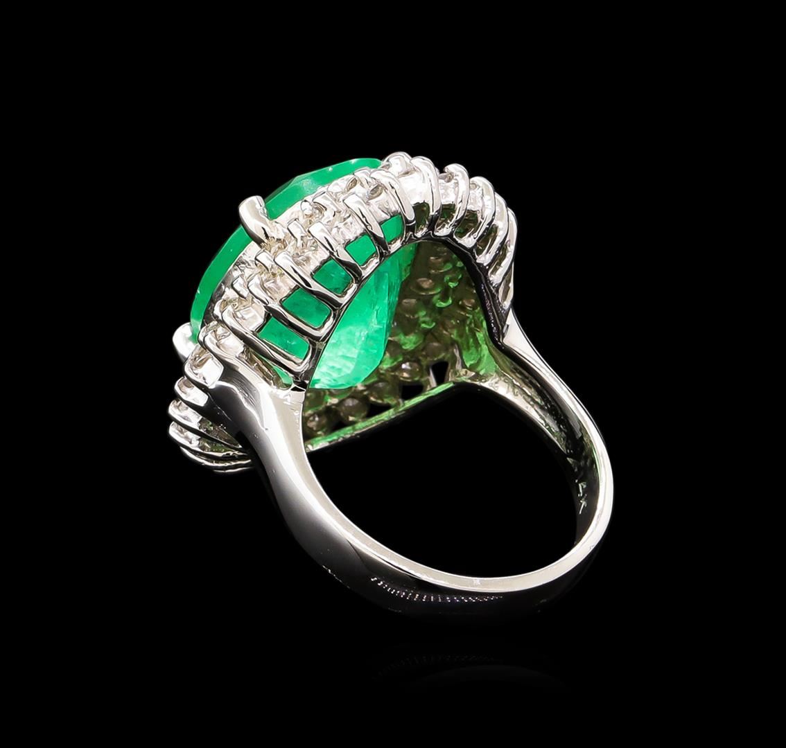One electronically tested 14KT white gold lady's cast fashion ring with a double basket halo with a bright polish finish. The featured lady's ring has a shank measuring 3.51 millimeters wide. Identified with markings of "14K". Condition is new, good workmanship. Containing: One prong set oval modified brilliant cut natural emerald, measuring 15.27 x 11.74 x 9.79mm, exact weight 10.05ct., clarity is moderately included, type III, medium, very slightly grayish, green color, (GIA G 5/3), cut is good. Transmitting light somewhat diffusely, transparent to translucent. Naturally occurring internal & external characteristics are present. Clarity enhanced. Graded loose prior to setting in the GIA Laboratory, Report #6177501873.Thirty prong set round brilliant cut diamonds, measuring 1.90 - 1.80 x 1.15mm (depth est.) approximate total weight of 30 Stones = 0.71ct. Graded in the setting. Clarity: SI-1 to SI-2. Color: G - Good Twenty-Six prong set round brilliant cut diamonds, measuring 1.70 - 1.60 x 1.02mm (depth est.) approximate total weight of 26 Stones = 0.44ct. Graded in the setting. Clarity: SI-1 to I-1. Color: G - Good. Total Weight of Colored Stones 10.05ct. Total Weight of Diamonds 1.15ct. Total Weight of Ring 9.40gm. GAS Appraised at $18,670.00.