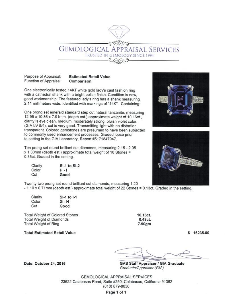 One electronically tested 14KT white gold lady's cast fashion ring with a cathedral shank with a bright polish finish. The featured lady's ring has a shank measuring 2.11 millimeters wide. Identified with markings of '14K'. Condition is new, good workmanship. Containing: One prong set emerald standard step cut natural tanzanite, measuring 12.95 x 10.86 x 7.91mm, (depth est.) approximate weight of 10.16ct., clarity is eye clean, medium, moderately strong, bluish violet color, (GIA bV 5/4), cut is very good. Transmitting light with no distortion, transparent. Colored gemstones are presumed to have been subjected to commonly used enhancement processes. Graded loose prior to setting in the GIA Laboratory, Report #5171847947. Ten prong set round brilliant cut diamonds, measuring 2.15 - 2.05 x 1.30mm (depth est.) approximate total weight of 10 Stones = 0.35ct. Graded in the setting. Clarity SI-1 to SI-2. Color: H - I Cut Good Twenty-Two prong set round brilliant cut diamonds, measuring 1.20 - 1.10 x 0.71mm (depth est.) approximate total weight of 22 Stones = 0.13ct. Graded in the setting. Clarity SI-1 to I-1. Color: G - H Cut Good. Total Weight of Colored Stones 10.16ct.. Total Weight of Diamonds 0.48ct.. Total Weight of Ring 7.90gm. GAS Appraised at $16,235.00.