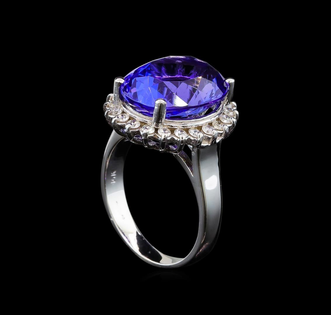 One electronically tested 14KT white gold lady's cast fashion ring with a basket halo with a bright polish finish. The featured lady's ring has a shank measuring 2.82 millimeters wide. Identified with markings of '14K'. Condition is new, good workmanship. Containing: One prong set oval modified brilliant cut natural tanzanite, measuring 14.87 x 12.05 x 8.00mm, (depth est.) approximate weight of 10.17ct., clarity is eye clean, medium dark, strong, violet color, (GIA V 6/5), cut is very good. Transmitting light with no distortion, transparent. Colored gemstones are presumed to have been subjected to commonly used enhancement processes. Graded loose prior to setting in the GIA Laboratory, Report #2175668411. Twenty-Two prong set round brilliant cut diamonds, measuring 1.80 - 1.70 x 1.05mm (depth est.) approximate total weight of 22 Stones = 0.43ct. Graded in the setting. Clarity SI-1 to I-1. Color: H - I Cut Good. Total Weight of Colored Stones 10.17ct.. Total Weight of Diamonds 0.43ct.. Total Weight of Ring 7.90gm. GAS Appraised at $17,125.00.