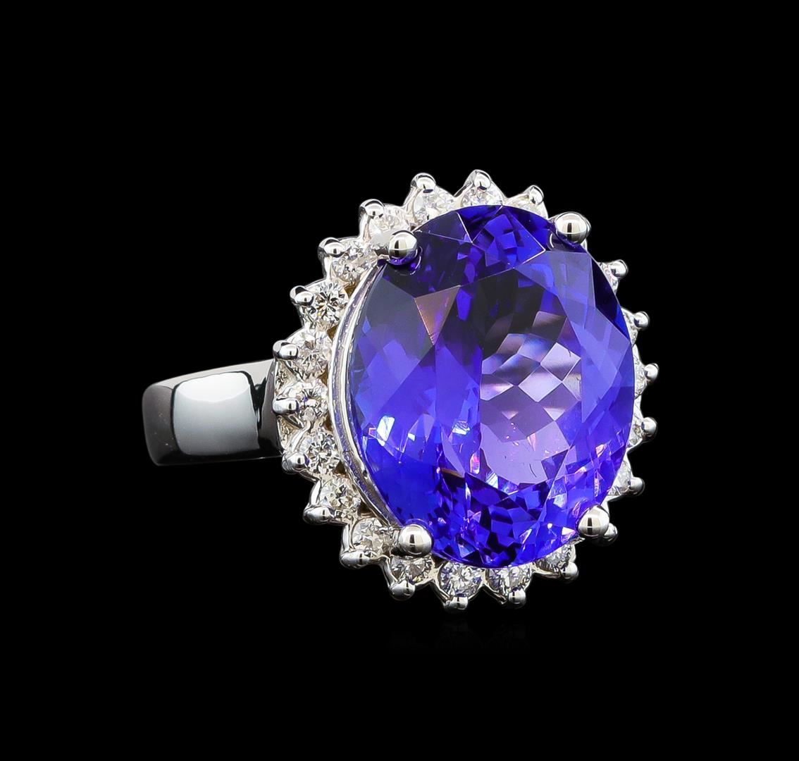 One electronically tested 14KT white gold lady's cast fashion ring with a basket halo with a bright polish finish. The featured lady's ring has a shank measuring 2.82 millimeters wide. Identified with markings of '14K'. Condition is new, good workmanship. Containing: One prong set oval modified brilliant cut natural tanzanite, measuring 14.87 x 12.05 x 8.00mm, (depth est.) approximate weight of 10.17ct., clarity is eye clean, medium dark, strong, violet color, (GIA V 6/5), cut is very good. Transmitting light with no distortion, transparent. Colored gemstones are presumed to have been subjected to commonly used enhancement processes. Graded loose prior to setting in the GIA Laboratory, Report #2175668411. Twenty-Two prong set round brilliant cut diamonds, measuring 1.80 - 1.70 x 1.05mm (depth est.) approximate total weight of 22 Stones = 0.43ct. Graded in the setting. Clarity SI-1 to I-1. Color: H - I Cut Good. Total Weight of Colored Stones 10.17ct.. Total Weight of Diamonds 0.43ct.. Total Weight of Ring 7.90gm. GAS Appraised at $17,125.00.