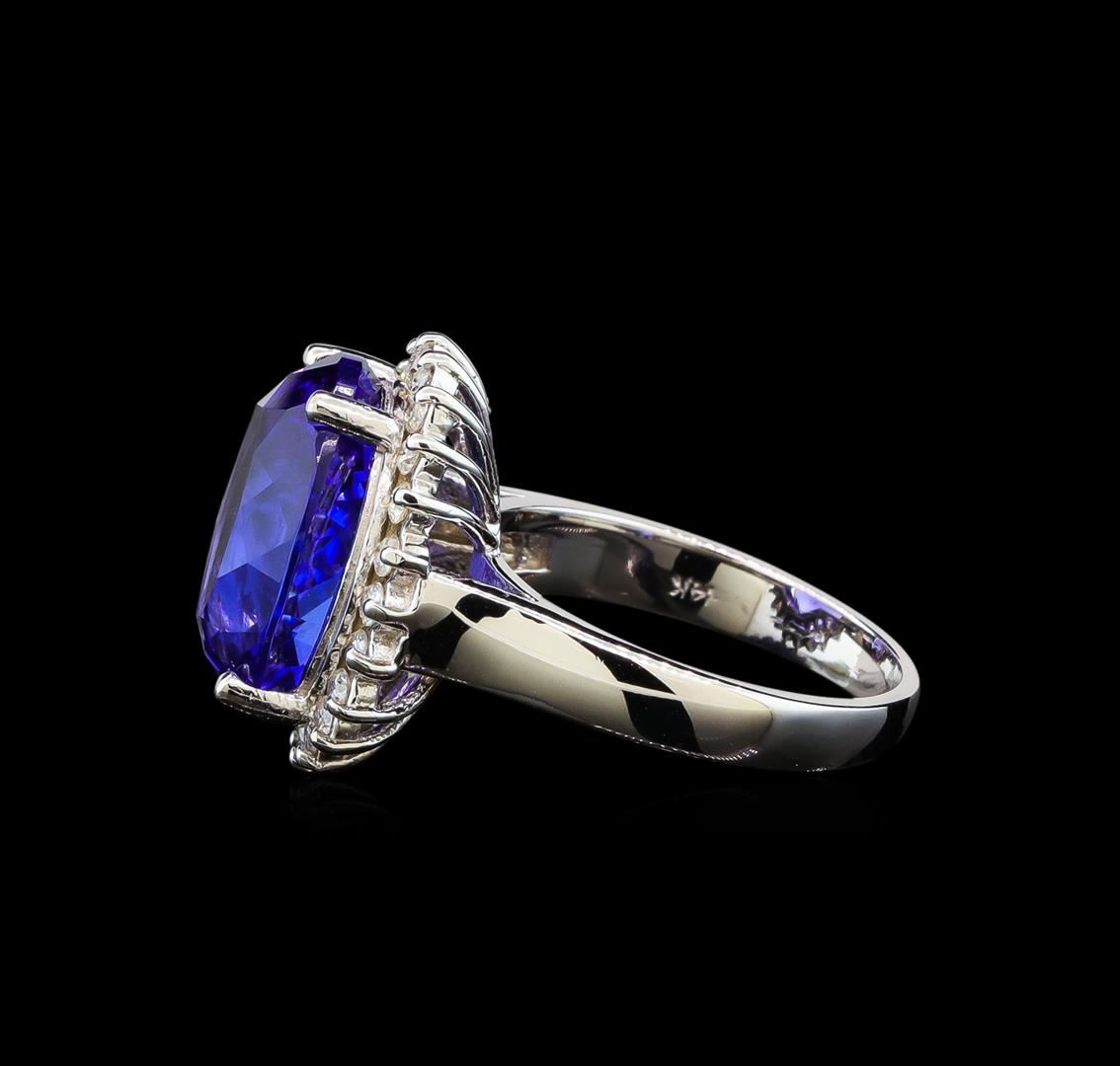 One electronically tested 14KT white gold lady's cast fashion ring with a basket halo with a bright polish finish. The featured lady's ring has a shank measuring 2.82 millimeters wide. Identified with markings of '14K'. Condition is new, good workmanship. Containing: One prong set oval modified brilliant cut natural tanzanite, measuring 14.87 x 12.05 x 8.00mm, (depth est.) approximate weight of 10.17ct., clarity is eye clean, medium dark, strong, violet color, (GIA V 6/5), cut is very good. Transmitting light with no distortion, transparent. Colored gemstones are presumed to have been subjected to commonly used enhancement processes. Graded loose prior to setting in the GIA Laboratory, Report #2175668411. Twenty-Two prong set round brilliant cut diamonds, measuring 1.80 - 1.70 x 1.05mm (depth est.) approximate total weight of 22 Stones = 0.43ct. Graded in the setting. Clarity SI-1 to I-1. Color: H - I Cut Good. Total Weight of Colored Stones 10.17ct.. Total Weight of Diamonds 0.43ct.. Total Weight of Ring 7.90gm. GAS Appraised at $17,125.00.