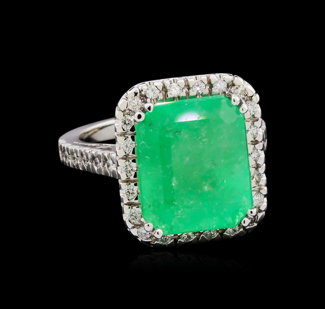 One electronically tested 14KT white gold lady's cast fashion ring with a basket halo with a bright polish finish. The featured lady's ring has a shank measuring 2.47 millimeters wide. Identified with markings of "14K". Condition is new, good workmanship. Containing: One prong set emerald step cut natural emerald, measuring 14.00 x 11.78 x 10.07mm, exact weight 10.54ct., clarity is severely included, type III, medium, very slightly grayish, green color, (GIA G 5/3), cut is good. Transmitting light diffusely, opaque to translucent. Naturally occurring internal & external characteristics are present. Clarity enhanced. Graded loose prior to setting in the GIA Laboratory, Report #2175501538.Thirty-Four prong set round brilliant cut diamonds, measuring 1.60 - 1.50 x 0.96mm (depth est.) approximate total weight of 34 Stones = 0.50ct. Graded in the setting. Clarity: SI-1 to I-1. Color: G - Good. Total Weight of Colored Stones 10.54ct. Total Weight of Diamonds 0.50ct. Total Weight of Ring 10.40gm. GAS Appraised at $9,475.00.