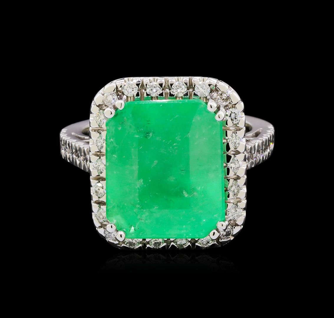 One electronically tested 14KT white gold lady's cast fashion ring with a basket halo with a bright polish finish. The featured lady's ring has a shank measuring 2.47 millimeters wide. Identified with markings of "14K". Condition is new, good workmanship. Containing: One prong set emerald step cut natural emerald, measuring 14.00 x 11.78 x 10.07mm, exact weight 10.54ct., clarity is severely included, type III, medium, very slightly grayish, green color, (GIA G 5/3), cut is good. Transmitting light diffusely, opaque to translucent. Naturally occurring internal & external characteristics are present. Clarity enhanced. Graded loose prior to setting in the GIA Laboratory, Report #2175501538.Thirty-Four prong set round brilliant cut diamonds, measuring 1.60 - 1.50 x 0.96mm (depth est.) approximate total weight of 34 Stones = 0.50ct. Graded in the setting. Clarity: SI-1 to I-1. Color: G - Good. Total Weight of Colored Stones 10.54ct. Total Weight of Diamonds 0.50ct. Total Weight of Ring 10.40gm. GAS Appraised at $9,475.00.