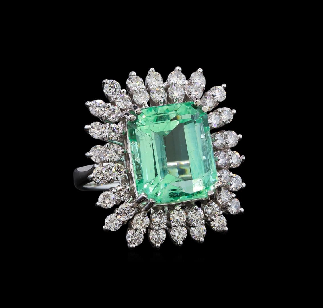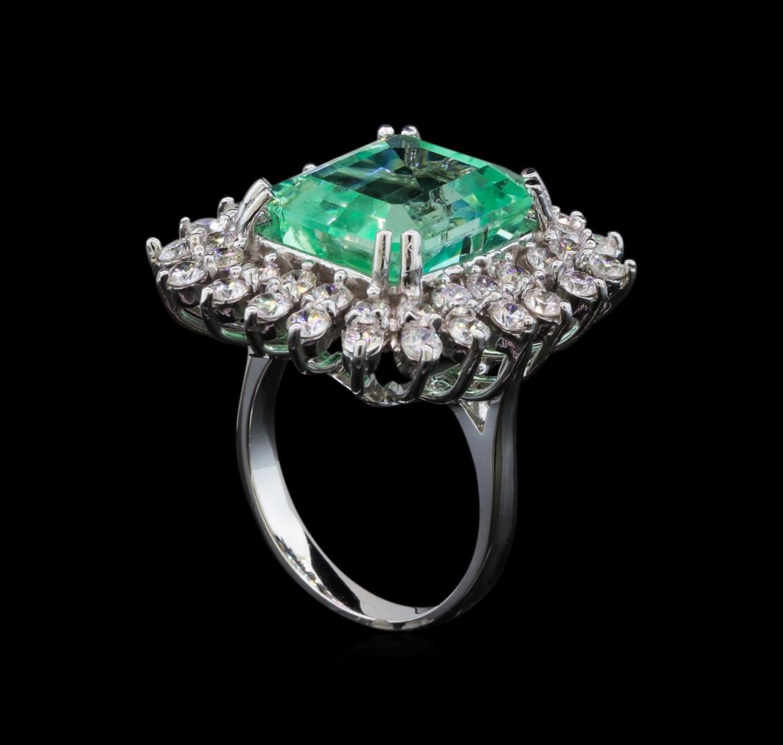 One electronically tested 14KT white gold lady's cast fashion ring with a double basket halo with a bright polish finish. The featured lady's ring has a shank measuring 2.86 millimeters wide. Identified with markings of 'K14'. Condition is new, good workmanship. Containing: One prong set emerald standard step cut natural emerald, measuring 13.91 x 12.02 x 8.86mm, (depth est.) approximate weight of 10.87ct., clarity is slightly included, medium, moderately strong, green color, (GIA G 5/4), cut is very good. Transmitting light with a minimum of distortion, transparent. Naturally occurring internal & external characteristics are present. Indications of oil residue. Colored gemstones are presumed to have been subjected to commonly used enhancement processes. Graded loose prior to setting in the GIA Laboratory, Report #2175664659. Forty-Four prong set round brilliant cut diamonds, measuring 2.50 - 2.35 x 1.46mm (depth est.) approximate total weight of 44 Stones = 2.28ct. Graded in the setting. Clarity SI-1 to I-1. Color: G - I Cut Good. Total Weight of Colored Stones 10.87ct.. Total Weight of Diamonds 2.28ct.. Total Weight of Ring 11.40gm. GAS Appraised at $31,660.00.
