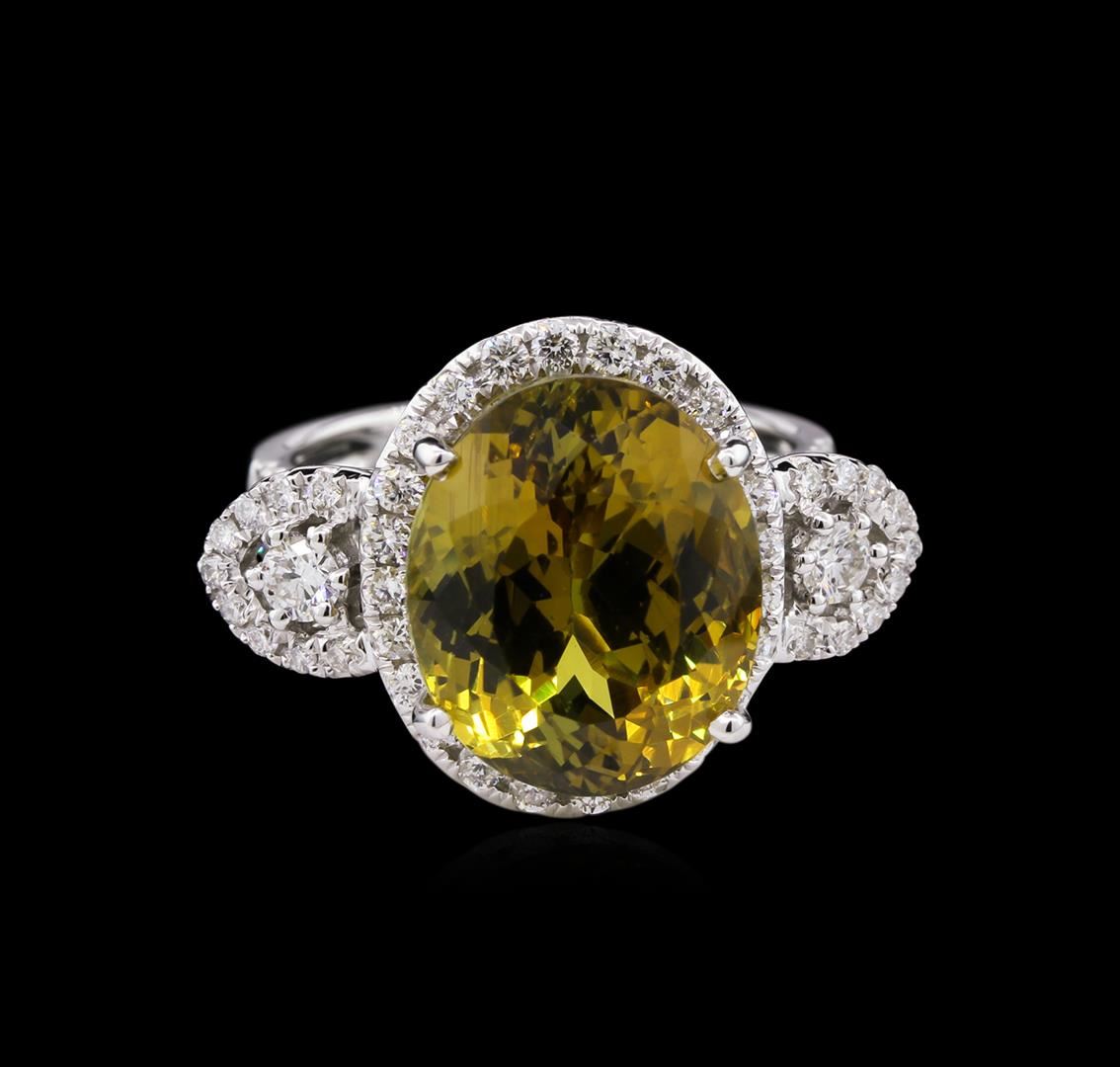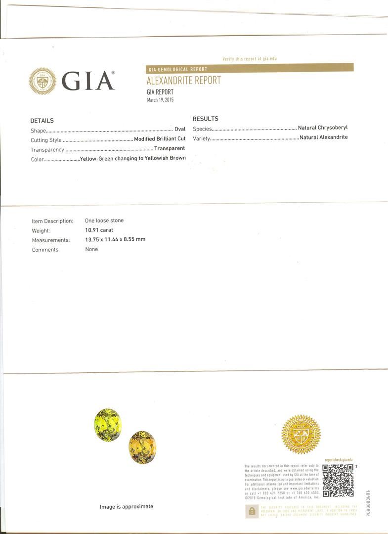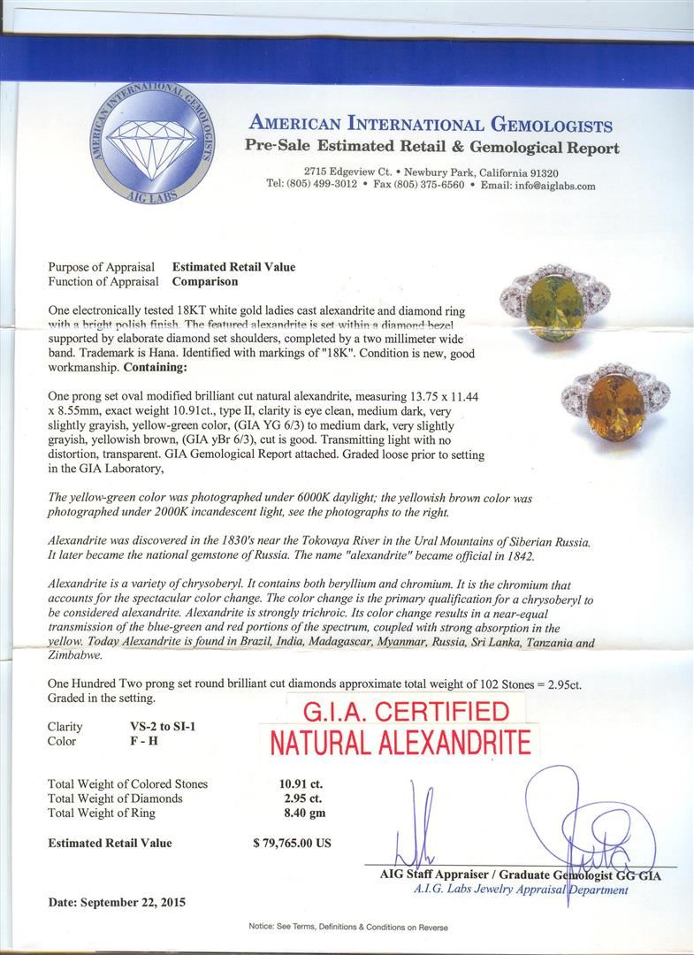 One electronically tested 18KT white gold ladies cast alexandrite and diamond ring with a bright polish finish. The featured alexandrite is set within a diamond bezel supported by elaborate diamond set shoulders, completed by a two millimeter wide band. Trademark is Hana. Identified with markings of "18K". Condition is new, good workmanship. Containing: One prong set oval modified brilliant cut natural alexandrite, measuring 13.75 x 11.44 x 8.55mm, exact weight 10.91ct., type II Clarity is eye clean, medium dark, very slightly grayish, yellow-green color, (GIA YG 6/3) to medium dark, very slightly grayish, yellowish brown, (GIA yBr 6/3), cut is good. Transmitting light with no distortion, transparent. GIA Gemological Report attached. Graded loose prior to setting in the GIA Laboratory, Report #5193637109.The yellow-green color was photographed under 6000K daylight; the yellowish brown color was photographed under 2000K incandescent light, see the photographs to the right. Alexandrite was discovered in the 1830's near the Tokovaya River in the Ural Mountains of Siberian Russia. It later became the national gemstone of Russia. The name "alexandrite" became official in 1842.Alexandrite is a variety of chrysoberyl. It contains both beryllium and chromium. It is the chromium that accounts for the spectacular color change. The color change is the primary qualification for a chrysoberyl to be considered alexandrite. Alexandrite is strongly trichroic. Its color change results in a near-equal transmission of the blue-green and red portions of the spectrum, coupled with strong absorption in the yellow. Today Alexandrite is found in Brazil, India, Madagascar, Myanmar, Russia, Sri Lanka, Tanzania and Zimbabwe. One Hundred Two prong set round brilliant cut diamonds approximate total weight of 102 Stones = 2.95ct. Graded in the setting. Clarity: VS-2 to SI-1. Color: F - H. Total Weight of Colored Stones 10.91ct. Total Weight of Diamonds 2.95ct. Total Weight of Ring 8.40gm. AIG Appraised at $79,765.00.