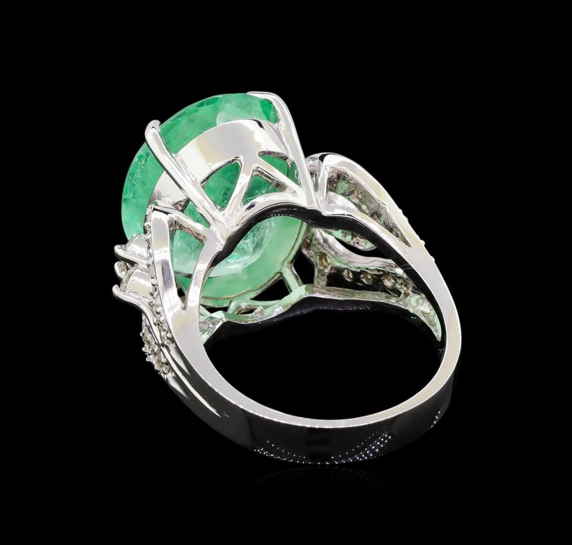 One electronically tested 14KT white gold lady's cast fashion ring with a split shank with a bright polish finish. The featured lady's ring has a shank measuring 3.72 millimeters wide. Identified with markings of "K14". Condition is new, good workmanship. Containing: One prong set oval modified brilliant cut natural emerald, measuring 15.99 x 13.33 x 9.39mm, exact weight 11.16ct., clarity is moderately included, type III, medium, very slightly grayish, green color, (GIA G 5/3), cut is good. Transmitting light somewhat diffusely, transparent to translucent. Naturally occurring internal & external characteristics are present. Clarity enhanced. Graded loose prior to setting in the GIA Laboratory, Report #2175501885.Four prong set round brilliant cut diamonds, measuring 2.80 - 2.60 x 1.65mm (depth est.) approximate total weight of 4 Stones = 0.29ct. Graded in the setting. Clarity: SI-1 to SI-2. Color: H - I. Cut Very Good Twenty-Four prong set round brilliant cut diamonds, measuring 2.00 - 1.90 x 1.17mm (depth est.) approximate total weight of 24 Stones = 0.65ct. Graded in the setting. Clarity: SI-1 to I-1. Color: H - I. Cut Good. Total Weight of Colored Stones 11.16ct. Total Weight of Diamonds 0.94ct. Total Weight of Ring 10.10gm. GAS Appraised at $23,975.00.