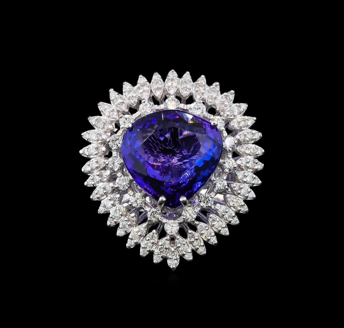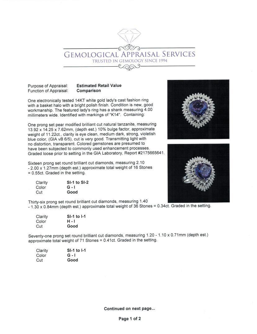 One electronically tested 14KT white gold lady's cast fashion ring with a basket halo with a bright polish finish. The featured lady's ring has a shank measuring 4.00 millimeters wide. Identified with markings of 'K14'. Condition is new, good workmanship. Containing: One prong set pear modified brilliant cut natural tanzanite, measuring 13.92 x 14.25 x 7.62mm, (depth est.) 10%. bulge factor, approximate weight of 11.22ct., clarity is eye clean, medium dark, strong, violetish blue color, (GIA vB 6/5), cut is very good. Transmitting light with no distortion, transparent. Colored gemstones are presumed to have been subjected to commonly used enhancement processes. Graded loose prior to setting in the GIA Laboratory, Report #2175665641. Sixteen prong set round brilliant cut diamonds, measuring 2.10 - 2.00 x 1.27mm (depth est.) approximate total weight of 16 Stones = 0.55ct. Graded in the setting. Clarity SI-1 to SI-2. Color: G - I Cut Good Thirty-Six prong set round brilliant cut diamonds, measuring 1.40 - 1.30 x 0.84mm (depth est.) approximate total weight of 36 Stones = 0.34ct. Graded in the setting. Clarity SI-1 to I-1. Color: H - I Cut Good Seventy-One prong set round brilliant cut diamonds, measuring 1.20 - 1.10 x 0.71mm (depth est.) approximate total weight of 71 Stones = 0.41ct. Graded in the setting. Clarity SI-1 to I-1. Color: G - I Cut Good. Total Weight of Colored Stones 11.22ct.. Total Weight of Diamonds 1.30 ct.. Total Weight of Ring 12.30gm. GAS Appraised.