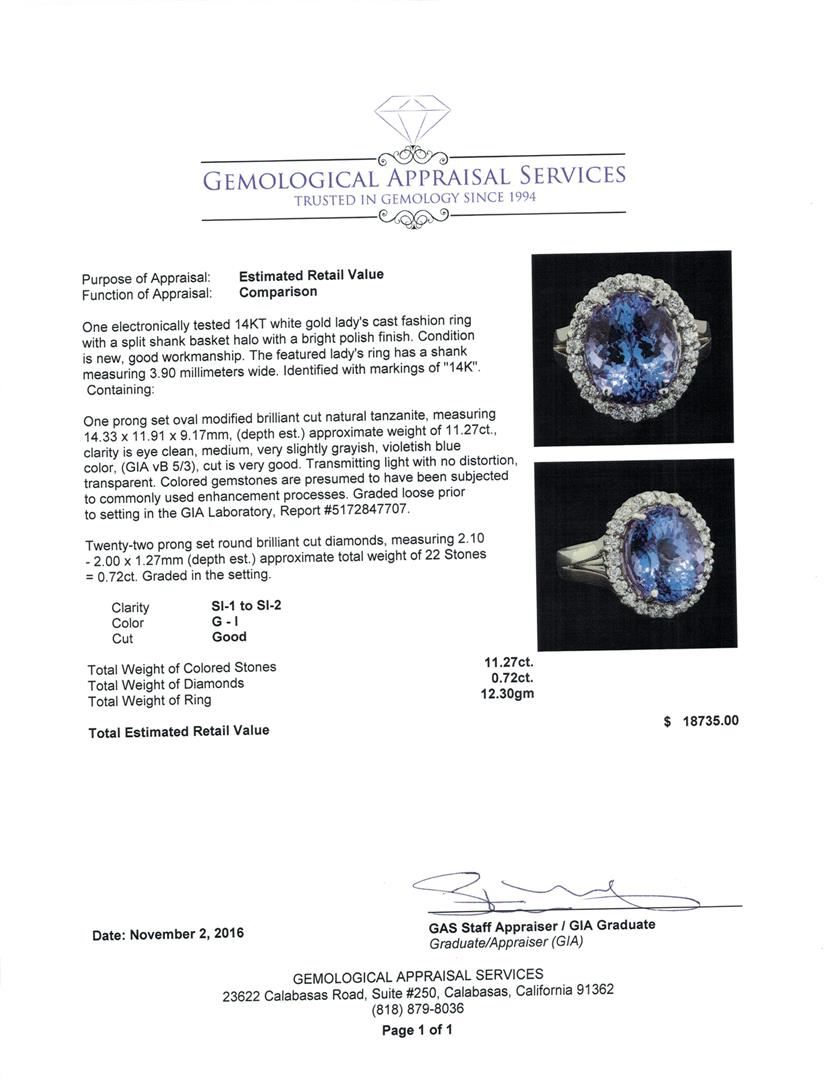 One electronically tested 14KT white gold lady's cast fashion ring with a split shank basket halo with a bright polish finish. The featured lady's ring has a shank measuring 3.90 millimeters wide. Identified with markings of '14K'. Condition is new, good workmanship. Containing: One prong set oval modified brilliant cut natural tanzanite, measuring 14.33 x 11.91 x 9.17mm, (depth est.) approximate weight of 11.27ct., clarity is eye clean, medium, very slightly grayish, violetish blue color, (GIA vB 5/3), cut is very good. Transmitting light with no distortion, transparent. Colored gemstones are presumed to have been subjected to commonly used enhancement processes. Graded loose prior to setting in the GIA Laboratory, Report #5172847707. Twenty-Two prong set round brilliant cut diamonds, measuring 2.10 - 2.00 x 1.27mm (depth est.) approximate total weight of 22 Stones = 0.72ct. Graded in the setting. Clarity SI-1 to SI-2. Color: G - I Cut Good. Total Weight of Colored Stones 11.27ct.. Total Weight of Diamonds 0.72ct.. Total Weight of Ring 12.30gm. GAS Appraised at $18,735.00.