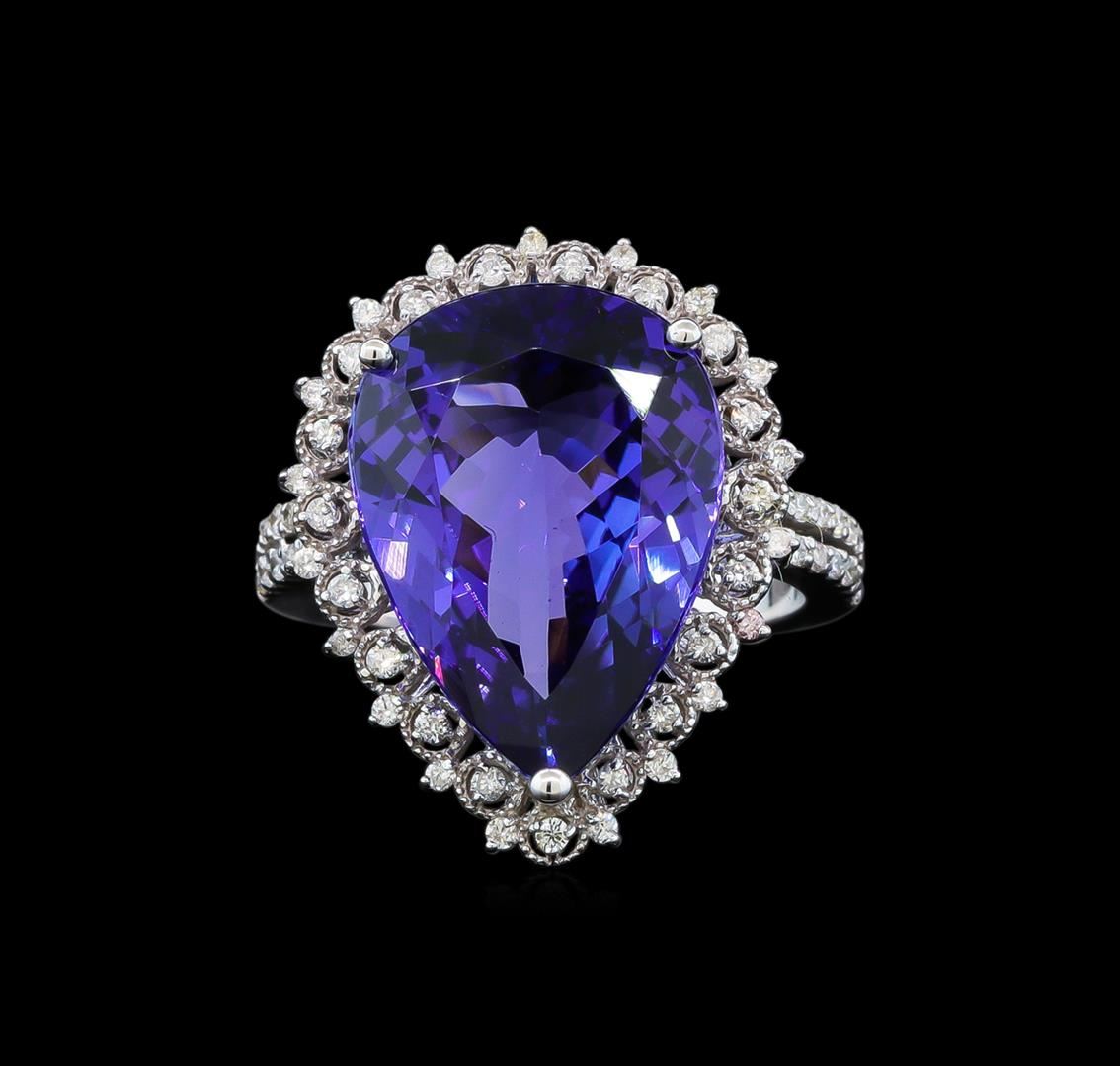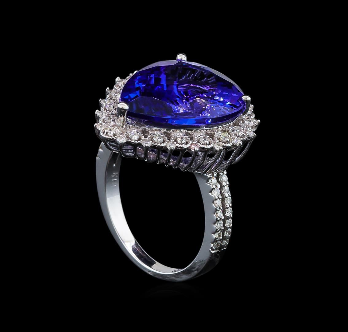 One electronically tested 14KT white gold lady's cast fashion ring with a split shank basket halo with a bright polish with milgrain detailing finish. The featured lady's ring has a shank measuring 2.18 millimeters wide. Identified with markings of 'K14'. Condition is new, good workmanship. Containing: One prong set pear modified brilliant cut natural tanzanite, measuring 18.23 x 13.23 x 7.20mm, (depth est.) approximate weight of 11.32ct., clarity is eye clean, medium, moderately strong, violetish blue color, (GIA vB 5/4), cut is very good. Transmitting light with no distortion, transparent. Colored gemstones are presumed to have been subjected to commonly used enhancement processes. Graded loose prior to setting in the GIA Laboratory, Report #5172665616. Sixty-Six prong set round brilliant cut diamonds, measuring 1.25 - 1.15 x 0.73mm (depth est.) approximate total weight of 66 Stones = 0.42ct. Graded in the setting. Clarity SI-1 to I-1. Color: G - I Cut Good. Total Weight of Colored Stones 11.32ct.. Total Weight of Diamonds 0.42ct.. Total Weight of Ring 7.60gm. GAS Appraised at $21,745.00.